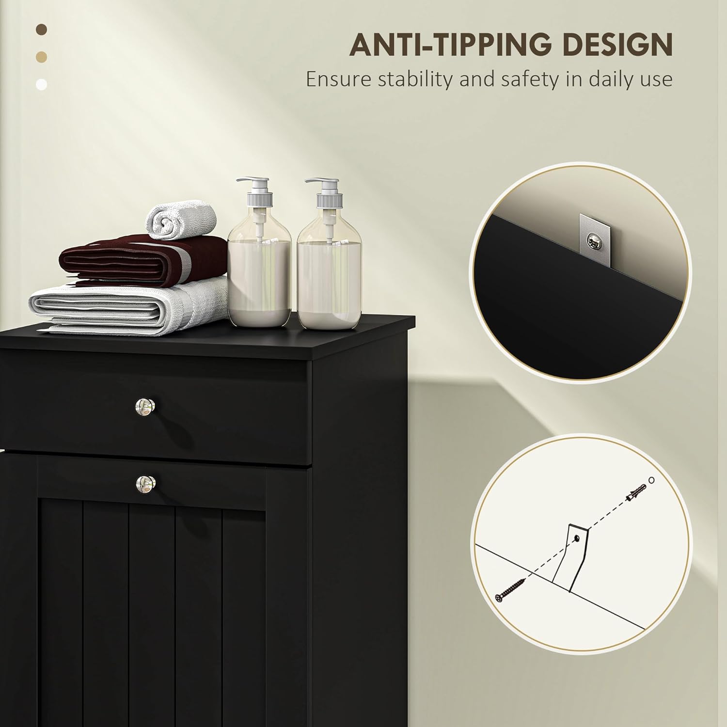 • Safety First: Our hidden laundry hamper cabinet features an anti-tipping design to prevent it from tipping over and enhances stability, ensuring safety for your home