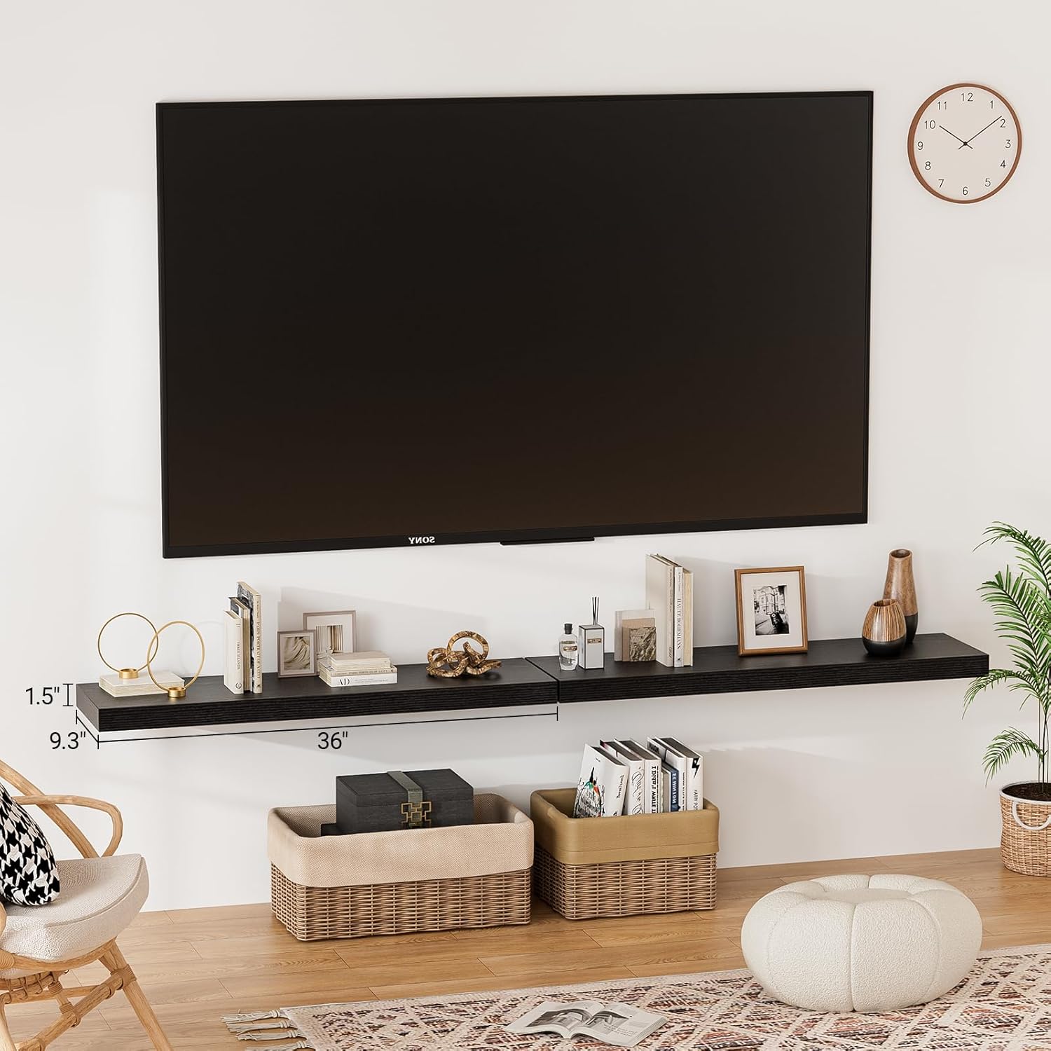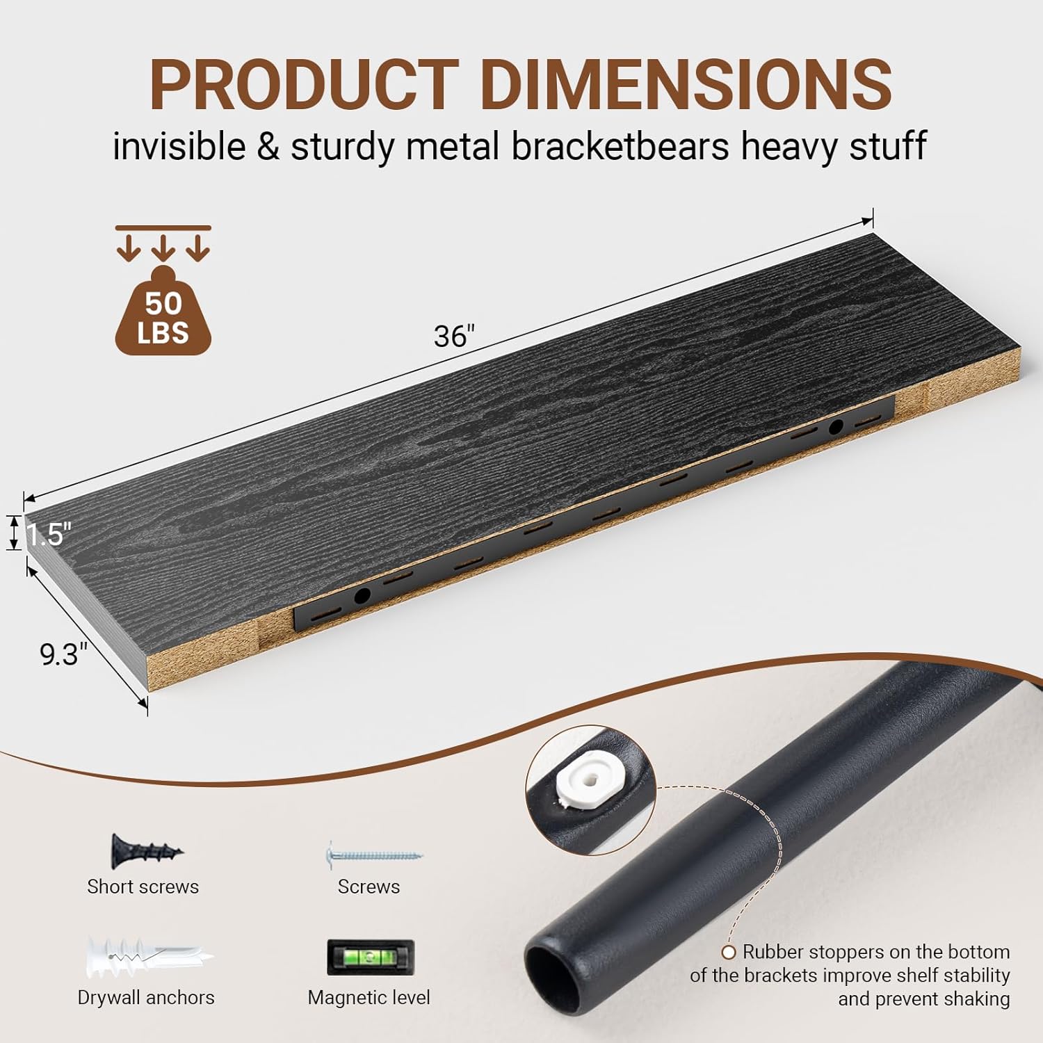 • 【Longer Design】Our pretty 36 inch wall shelves are 36"W x 9.3"D x 1.5"H.Our black shelves for wall is longer than traditional designs and can hold more items.The 36 inch floating shelf optimize wall space,helping organize essentials without taking up floor space in your home.