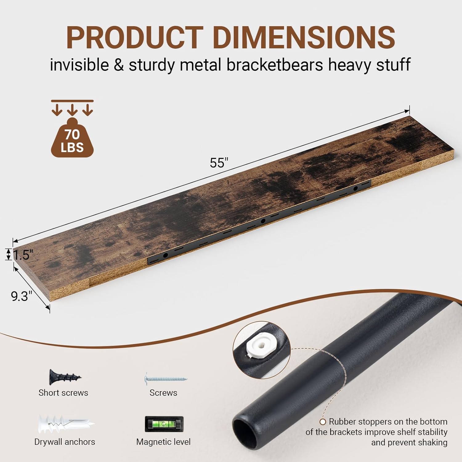 • 【Longer Design】Our pretty wall shelves are 55"W x 9.3"D x 1.5"H.Our brown floating shelves is longer than traditional designs and can hold more items.The rustic brown floating shelves optimize wall space,helping organize essentials without taking up floor space in your home.