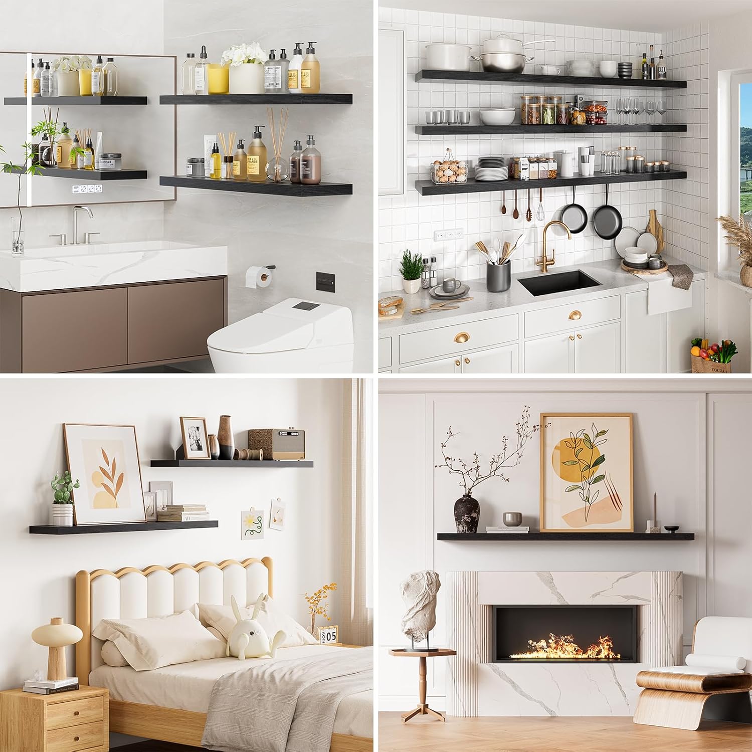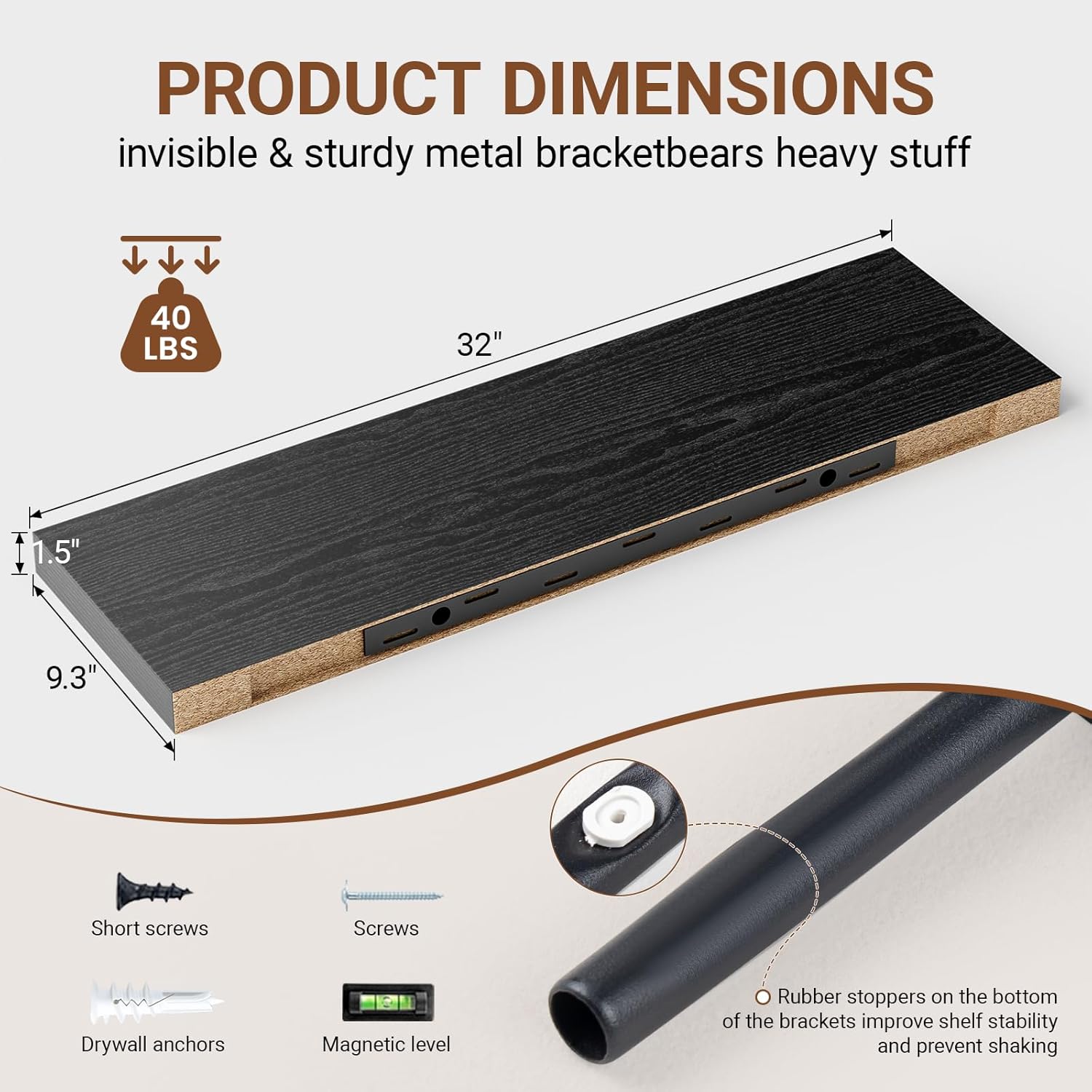 • 【Longer Design】Our pretty 32 inch black wall shelves are 32"W x 9.3"D x 1.5"H.Our 32 floating shelves is longer than traditional designs and can hold more items.The black floating shelf optimize wall space,helping organize essentials without taking up floor space in your home.