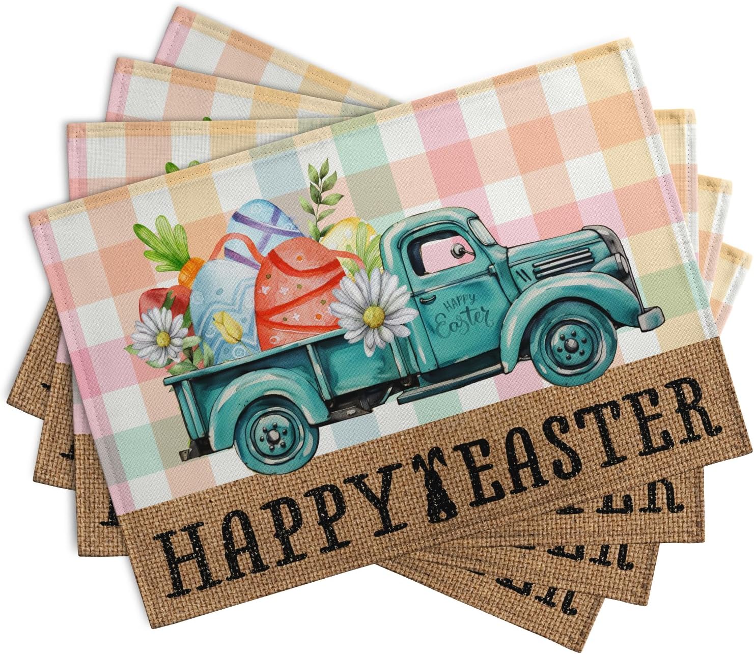 • TABLE DECORATION: Easter egg truck table place mats feature high-definition printing technology for crisp, clear patterns and vibrant colors; colorful buffalo plaid placemats with a cute truck pattern; unique and eye-catching seasonal patterns add charm to spring easter placemats, creating a festive atmosphere for your party