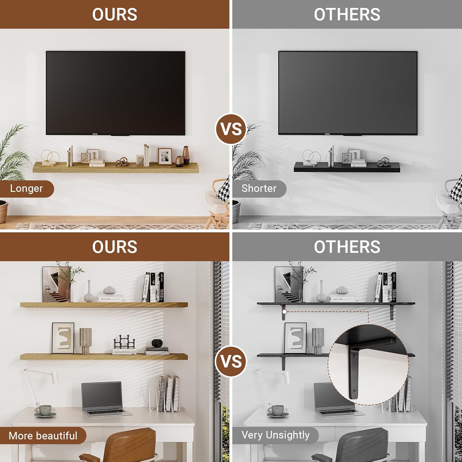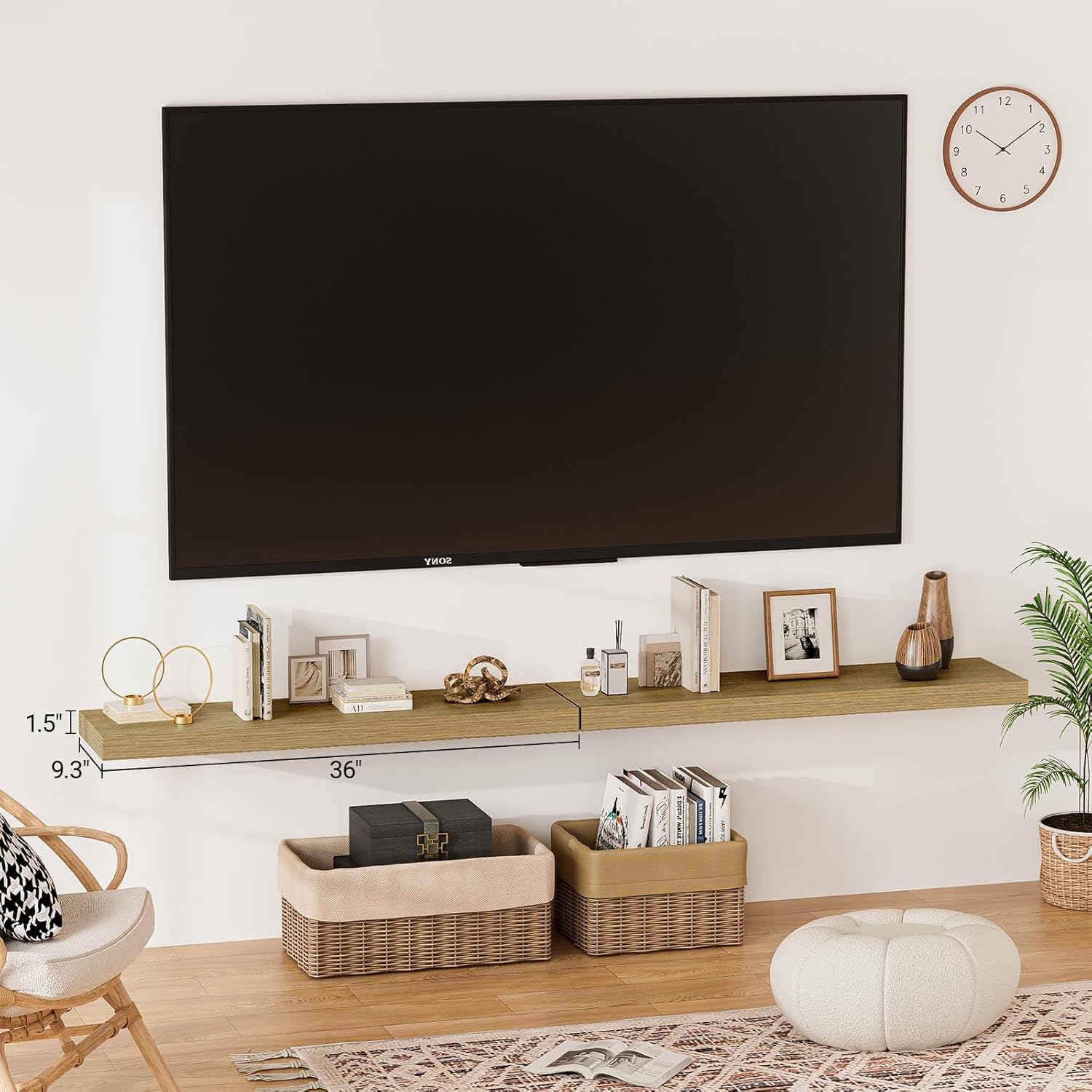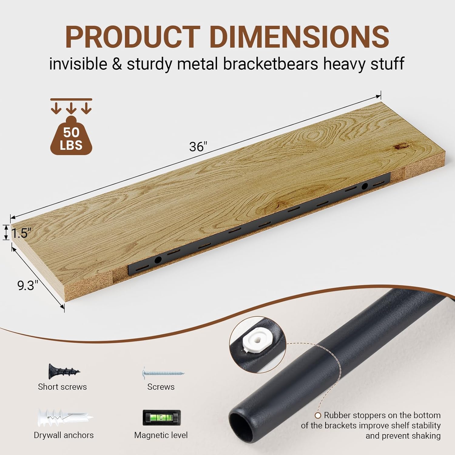 • 【Longer Design】Our pretty 36 inch wall shelves are 36"W x 9.3"D x 1.5"H.Our floating shelves oak is longer than traditional designs and can hold more items.The 36 inch floating shelf optimize wall space,helping organize essentials without taking up floor space in your home.