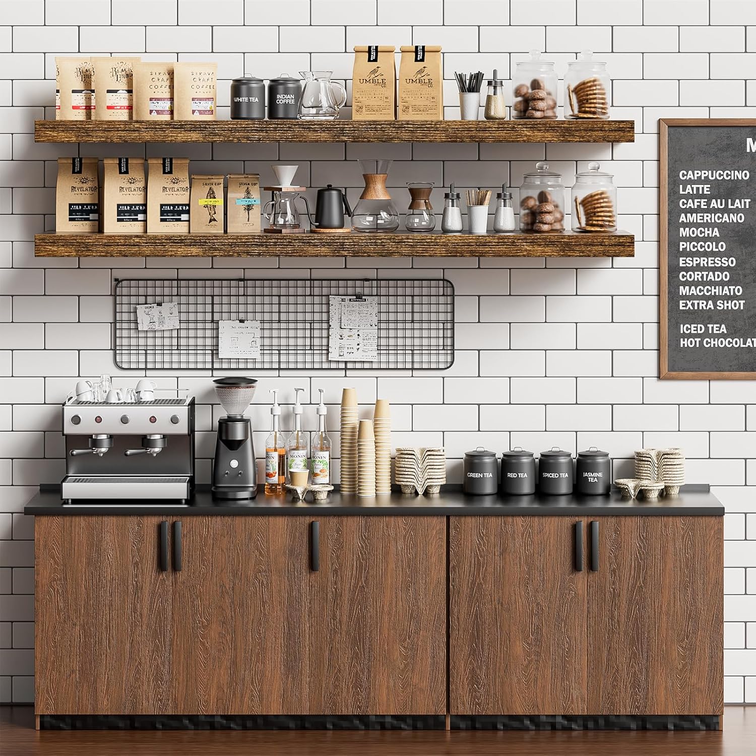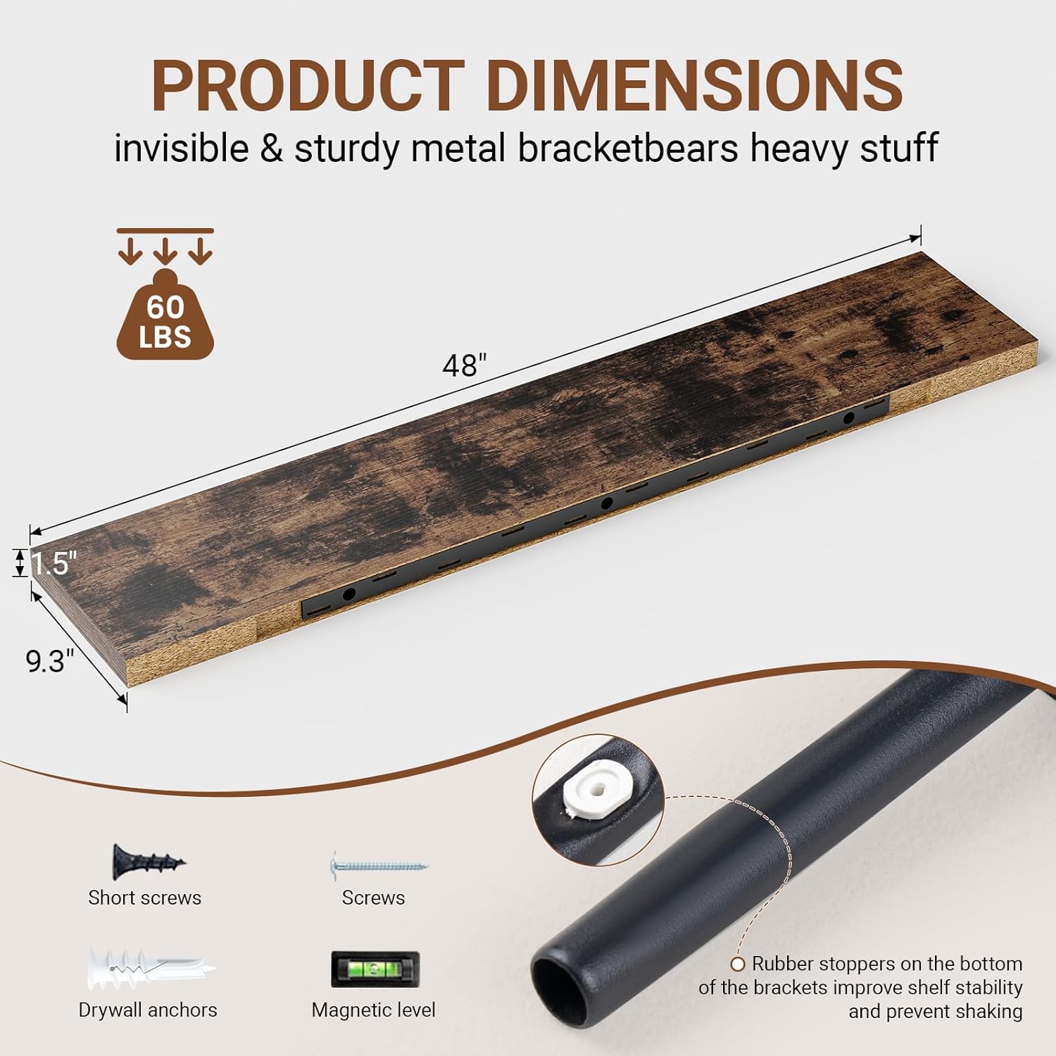 • 【Longer Design】Our pretty wall shelves are 48"W x 9.3"D x 1.5"H.Our brown floating shelves is longer than traditional designs and can hold more items.The rustic brown floating shelves optimize wall space,helping organize essentials without taking up floor space in your home.