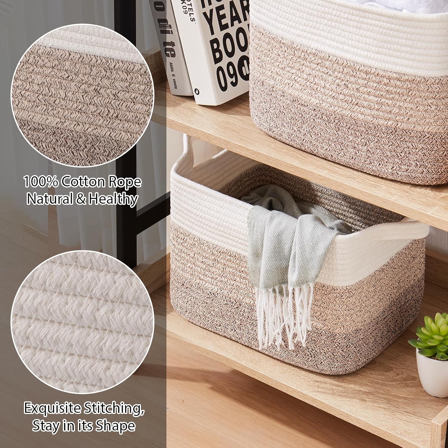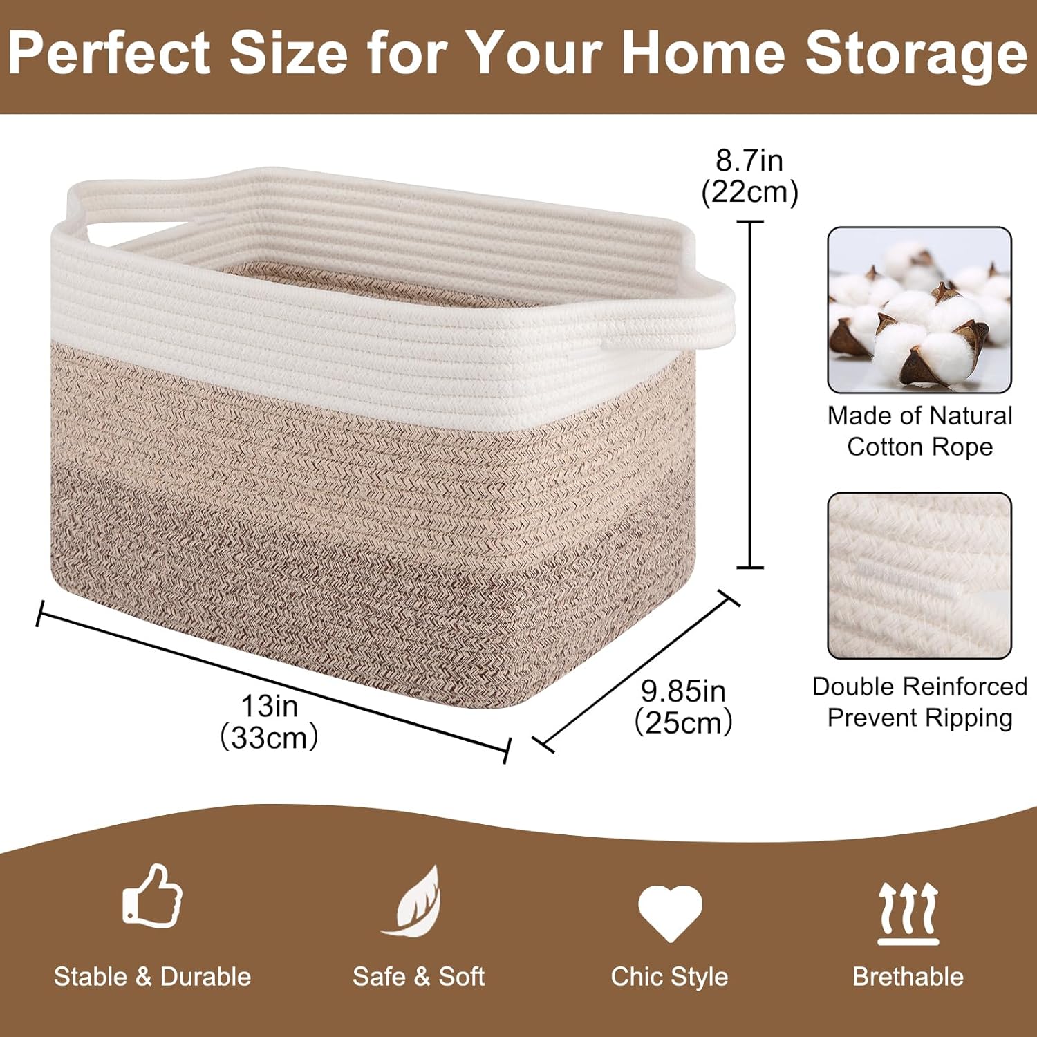 • Multifunctional Storage Basket: 13" x 9.85" x 8.7" shelf basket for organizing, which are designed to fit perfectly on living room, bedroom, bathroom, baby room, office to store household items (towels, toiletries, stuffed animals, books, baby diapers, etc.)
