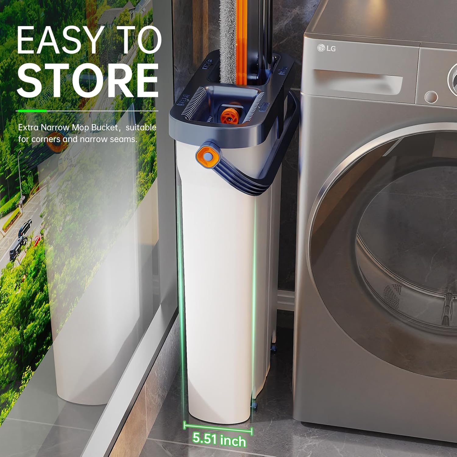 • Space-Saving Design & Additional Features: The narrow, compact bucket fits into tight spaces like behind doors or in narrow gaps. Additionally, the mop features two extra holes for cleaning solutions and is compatible with paper towels or thin pads. The automatic rebound mop head and soft scraper make cleaning in bathrooms or other wet areas easy.