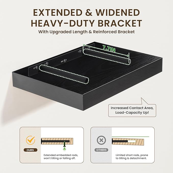 • UPGRADED MOUNTING SYSTEM-The extended supporting bars on the metal brackets ensure our wall shelves remain sturdy, preventing any wobbling or sagging. Plus, the included plastic plugs guarantee the shelves to stay firmly in place
