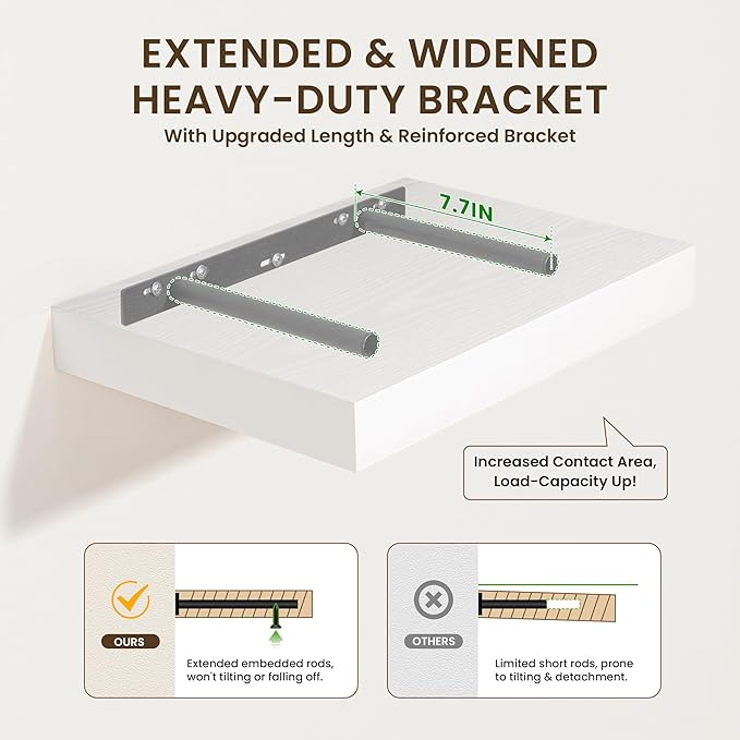 • UPGRADED MOUNTING SYSTEM-The extended supporting bars on the metal brackets ensure our wall shelves remain sturdy, preventing any wobbling or sagging. Plus, the included plastic plugs guarantee the shelves to stay firmly in place