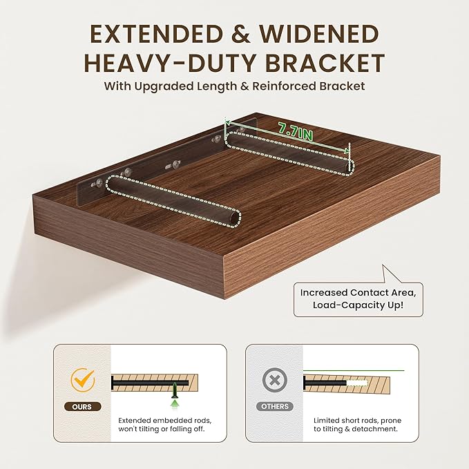 • UPGRADED MOUNTING SYSTEM-The extended supporting bars on the metal brackets ensure our wall shelves remain sturdy, preventing any wobbling or sagging. Plus, the included plastic plugs guarantee the shelves to stay firmly in place