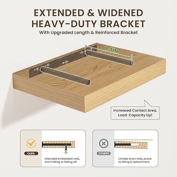 • UPGRADED MOUNTING SYSTEM-The extended supporting bars on the metal brackets ensure our wall shelves remain sturdy, preventing any wobbling or sagging. Plus, the included plastic plugs guarantee the shelves to stay firmly in place