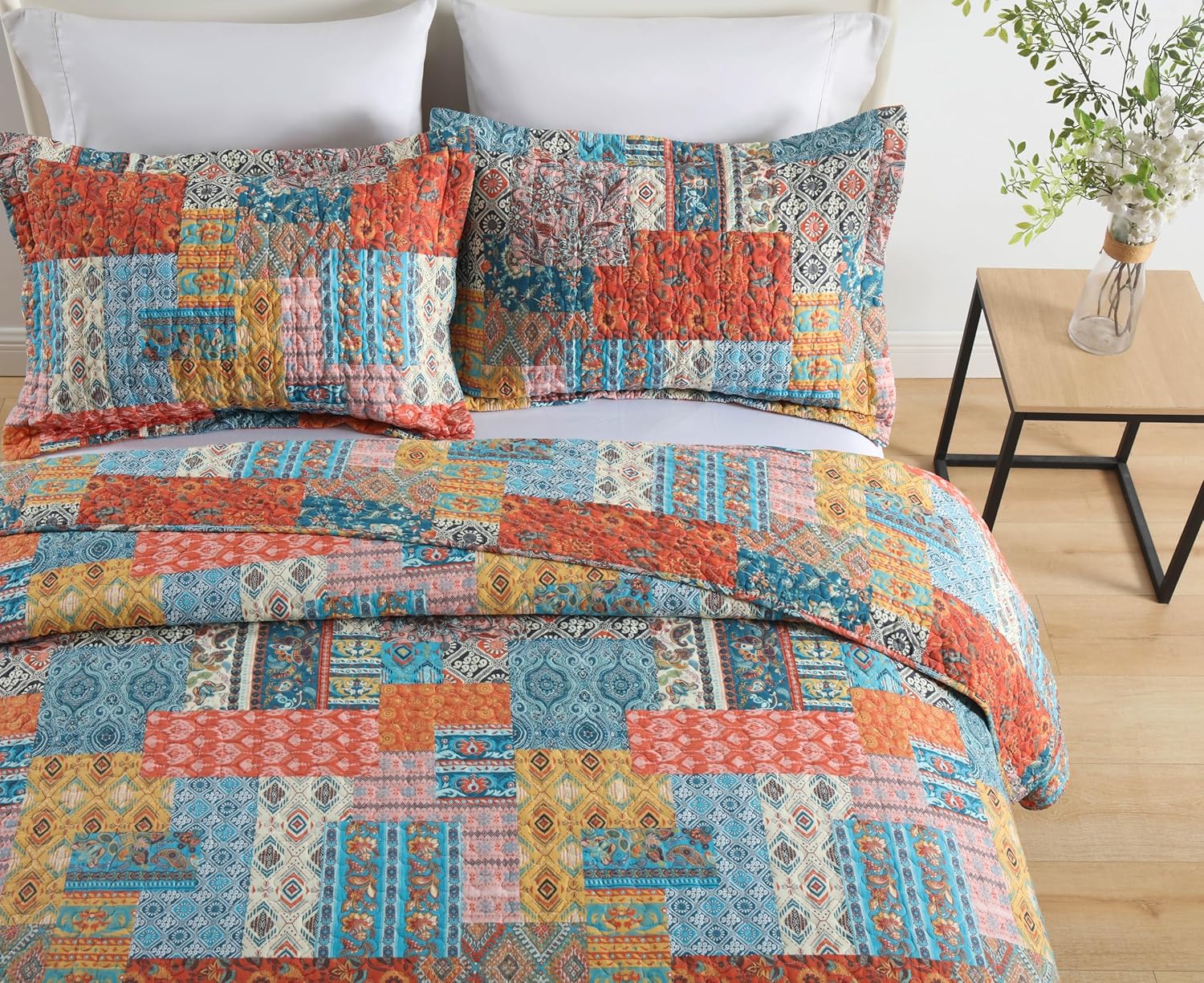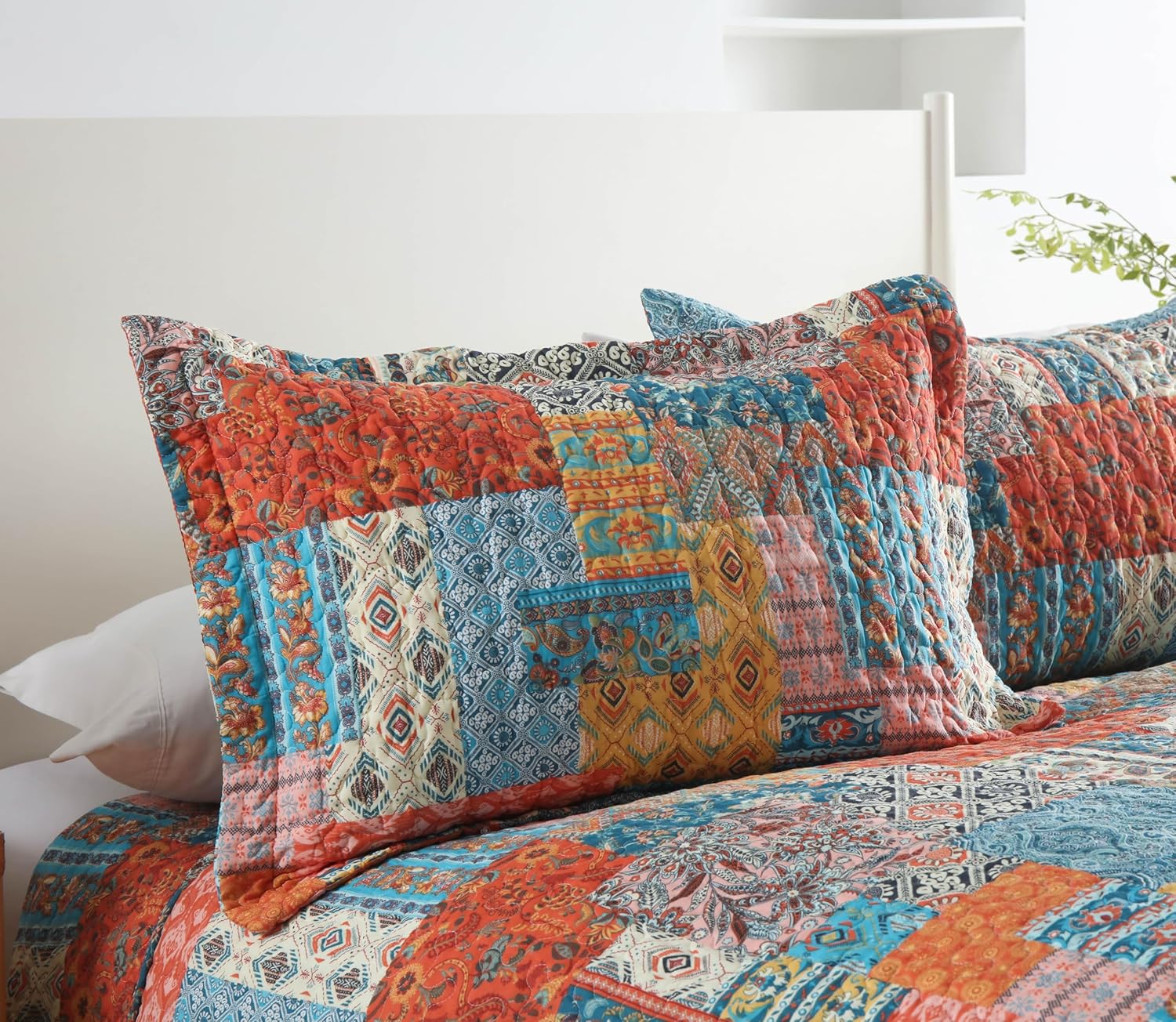 • Vintage orange and blue bohemian patchwork pattern making your room more elegant and charming, creating a wonderful bedroom space