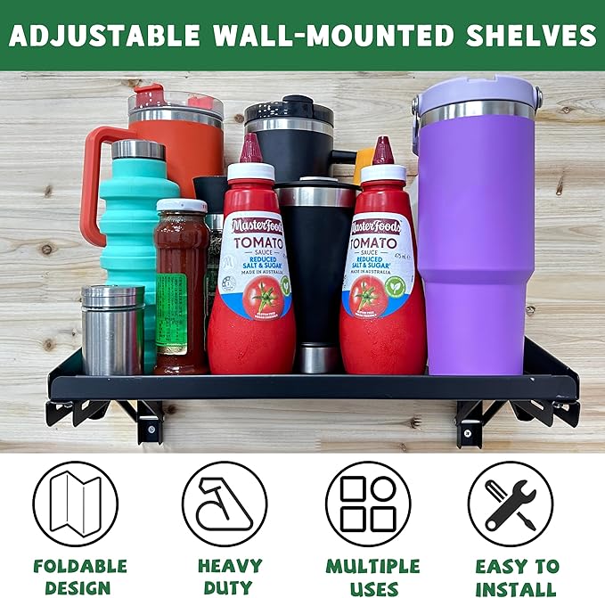• [Space Saving Adjustable Rail Shelf]: The wall mounted shelf is an ideal solution for optimizing space. Because it can easily fold flat against the wall when not needed, instantly free up valuable floor space. keeping your garage organized and tidy