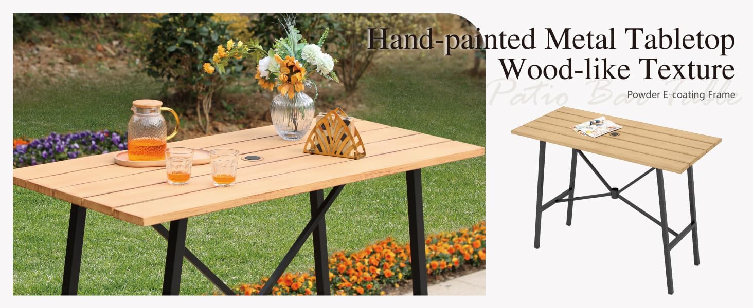 • 【Barheight Patio Table and Chairs】Combines ergonomic high back design with seamless swivel functionality, this bar set provides a stylish and elevated seating option that adds flair to any space. Patio bar table features a handpainted tabletop with woodlike texture. Umbrella hole: 1.57
