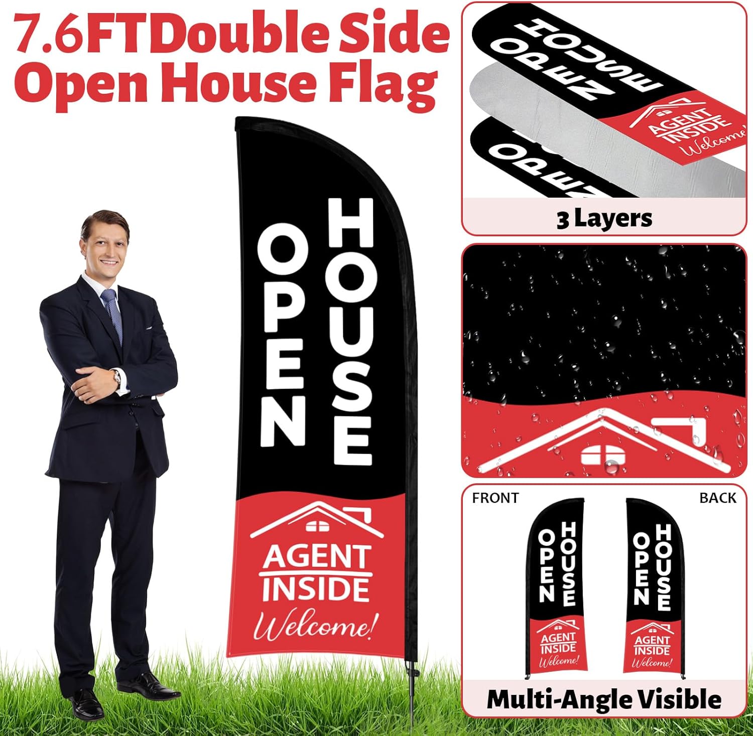 • 44 Pcs Open House Supplies:Package Included: 7.6 x 5.4 Ft:Double-sided Flag with Poles (1x Drawstring bag), 5 Pack x Real Estate Sale Signs with Stakes Double Sided:16 x 12 inches ; 30 PCS x Open House Balloons, 1 Roll x Curling Ribbon, 2 PCS x Balloon Glue Point, 1 PCS x Marker Pen, 4 PCS x Water Bottle Hang Tags, Open house signs for real estate agent and house for sale signs by owner.