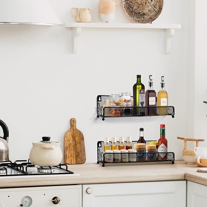• Multi-Purpose Storage Solution: Use these racks as a spice rack wall mounted AND countertop, pantry door organizer, or hanging storage baskets organizer. Great for organizing spices, toiletries, cleaning supplies, or decorative items in any room.Space-Saving and Organized Storage: Designed as a pantry door organizer and hanging storage baskets organizer, this wall mount rack maximizes space efficiency in any room. Keep your kitchen, pantry, bathroom, or shower clutter-free and organized.