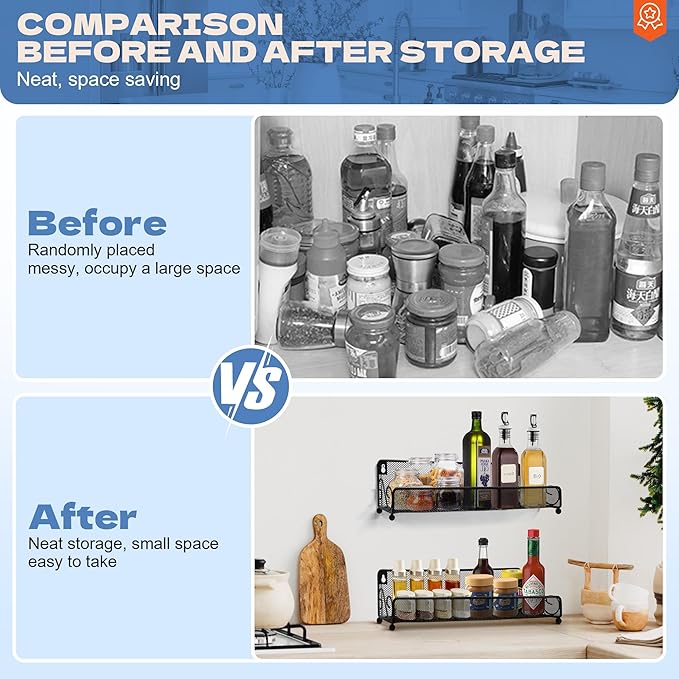 • Premium Metal Material and Stable Storage: The spice rack wall mounted is made of thickened high-strength carbon steel,is waterproof, rustproof, easy to clean.Our spice rack comes with additional 2.36-inch side guards and reinforced adhesive stickers to ensure safety and stability.
