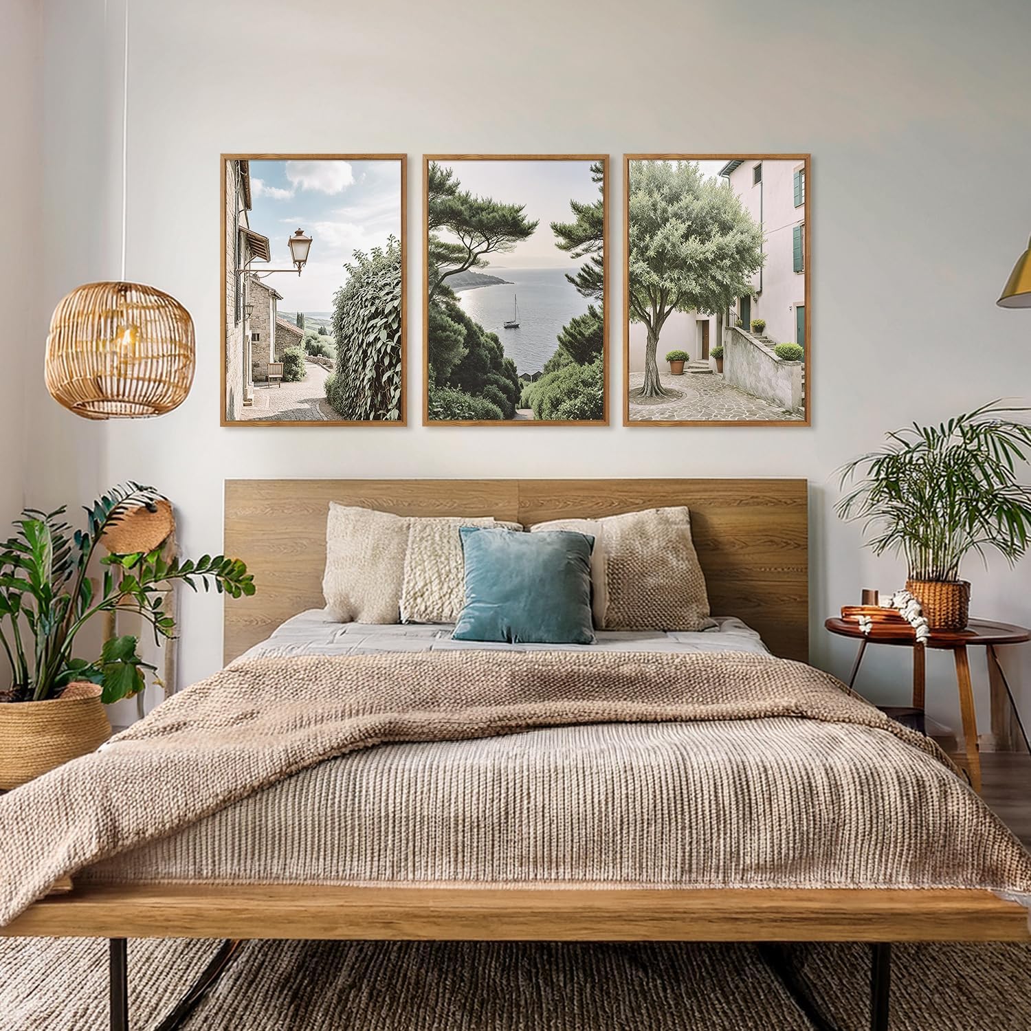 Aurlan Neutral Italy Cityscape Gallery Framed Wall Art(16"x24"), 3PCS Vintage Mediterranean Countryside Landscape Canvas Artwork, Large Town Coast Streets Travel Decor Prints for Office Home