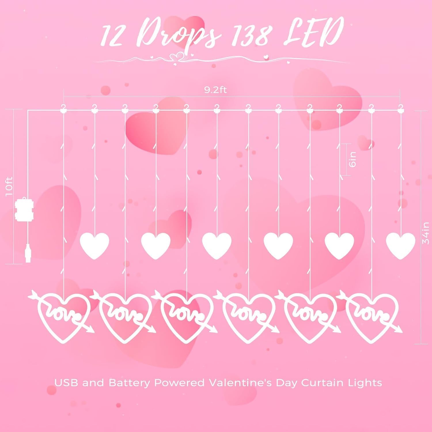 • Valentines Day Window Curtain Lights : Love heart window curtain lights with 138 Led, 12 Love Heart ornaments, 6 big love heart lights and 6 small heart lights, exudesing a soft and charming light, creating a romantic evening atmosphere for you