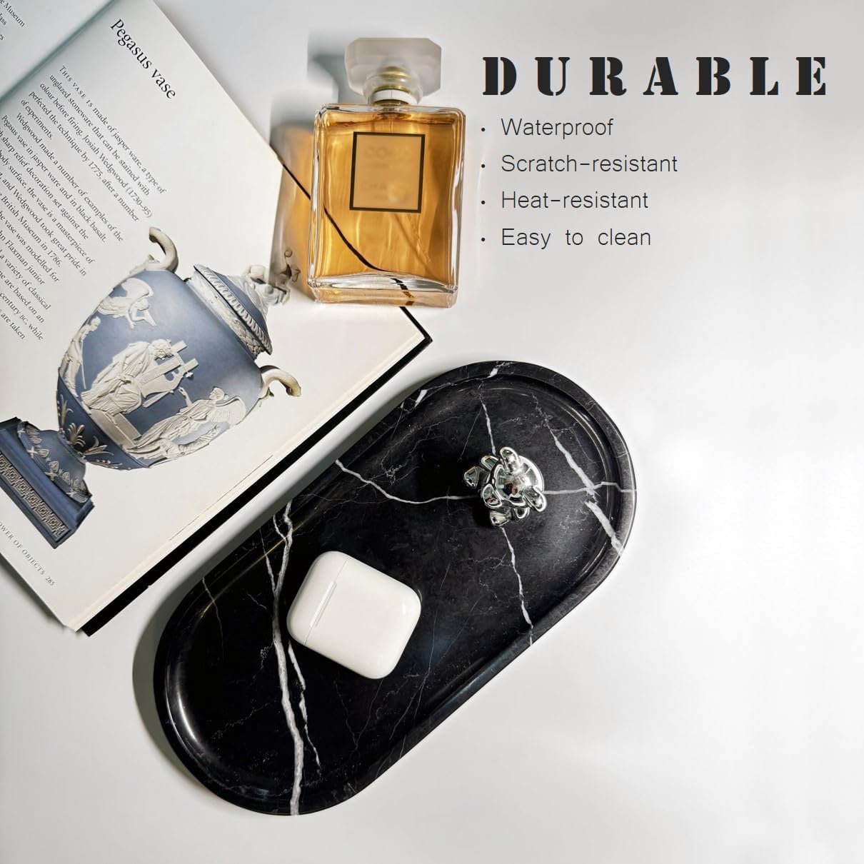 • NATURAL MARBLE FROM CHINA: Made from premium Black Root marble sourced in Guangxi, China. This marble oval tray showcases striking black-and-white natural veins, making each piece unique. A durable luxury stone tray that is stain-resistant, long-lasting, and perfect as a decorative tray for jewelry, perfume, or candles