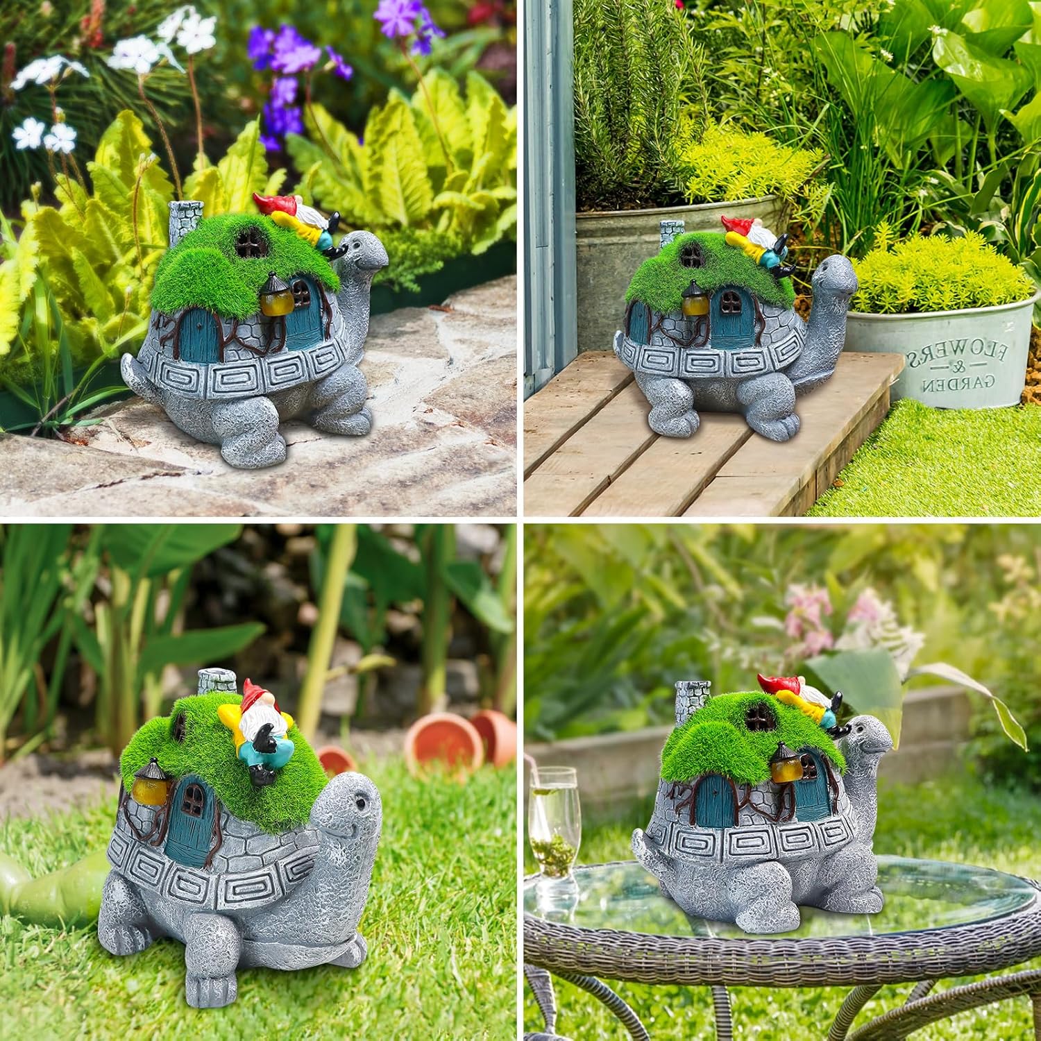 • The Turtle Decor Cute: A charming turtle house solar light, featuring a luminous design, harmonizes with lush lawns and little gnome, transforming into a warm, delightful highlight at night, infusing gardens with playfulness and vitality. As a solar-powered garden decor, this cute turtle carried the gnome on his back, decorating gardens, patios, porches, and water features with creativity and charm.