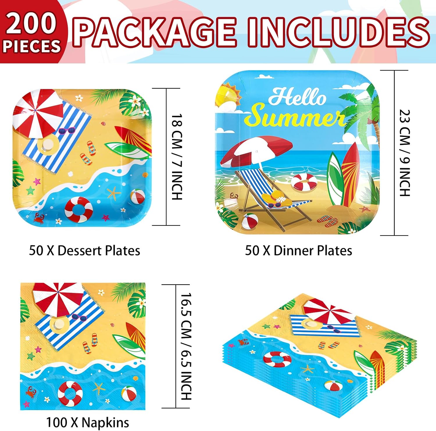 Grencian 200Pcs Beach Party Supplies Hello Summer Party Plates and Napkins Disposable Summer Pool Paper Tableware Set for Hawaiian Beach Pool Birthday Baby Showe Decorations, Serves 50