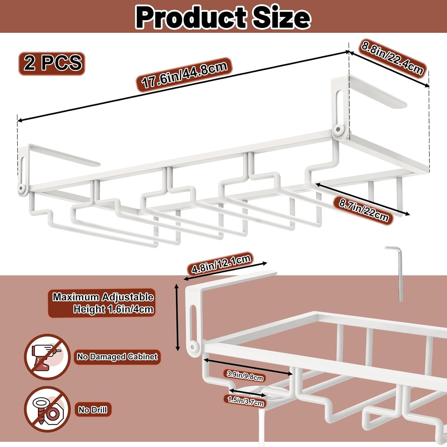• 【Adiustable Wine Glass Rack】You can adjust the rack's mezzanine width to fit your cupboard, fit for 0.2-1.6in thickness(0.5-4CM). The perforation-free installation design makes the wine glass holder not only suitable for wooden partitions, but also for floating plates of different materials such as stone plates and glass partitions.