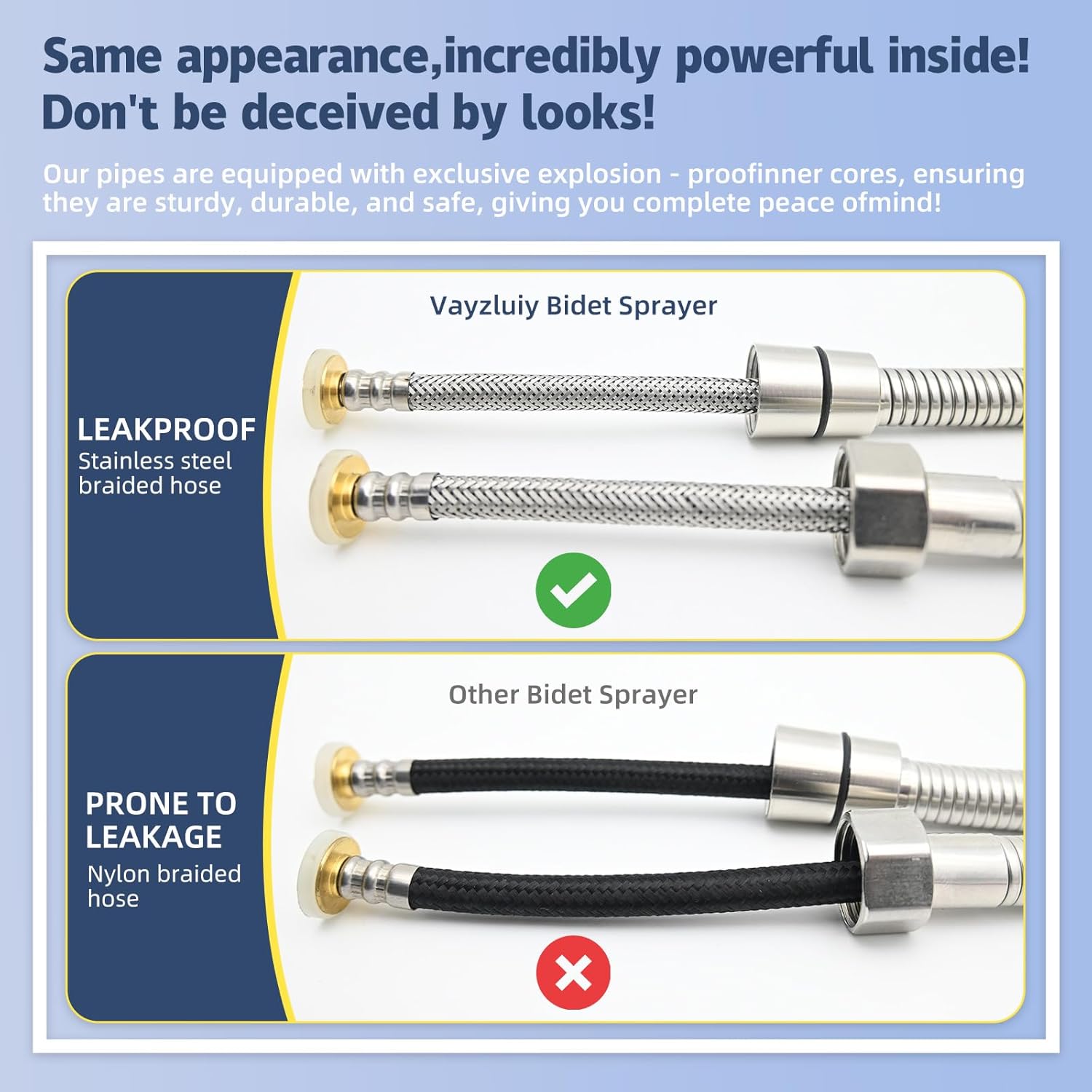 • High-Quality Craftsmanship - Elevate your hygiene with the Vayzluiy Handheld Bidet Sprayer. Crafted with precision, featuring a solid brass valve body, a 304 stainless steel sprayer, and leak-proof stainless steel braided hose, this product ensures years of reliable use.