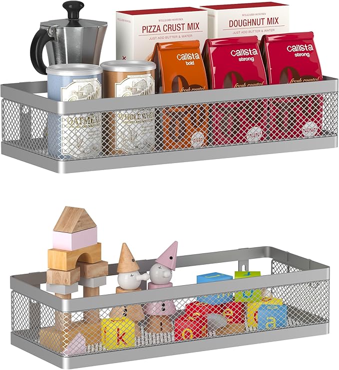 • 【MULTI-PURPOSE&MULTIFUNCTIONAL】The perfect solution for organizing a multitude of every items indoor or outdoor. The cabinet organizer hanging baskets wall mount is Ideal for organizing and storing spice bottles, pantry items, snacks, toiletries, tools, craft supplies,etc. And this metal bin basket free up enough space for your homes, kitchen, living room, bathroom, camper, farmhouse, apartments, college dorm rooms, etc.