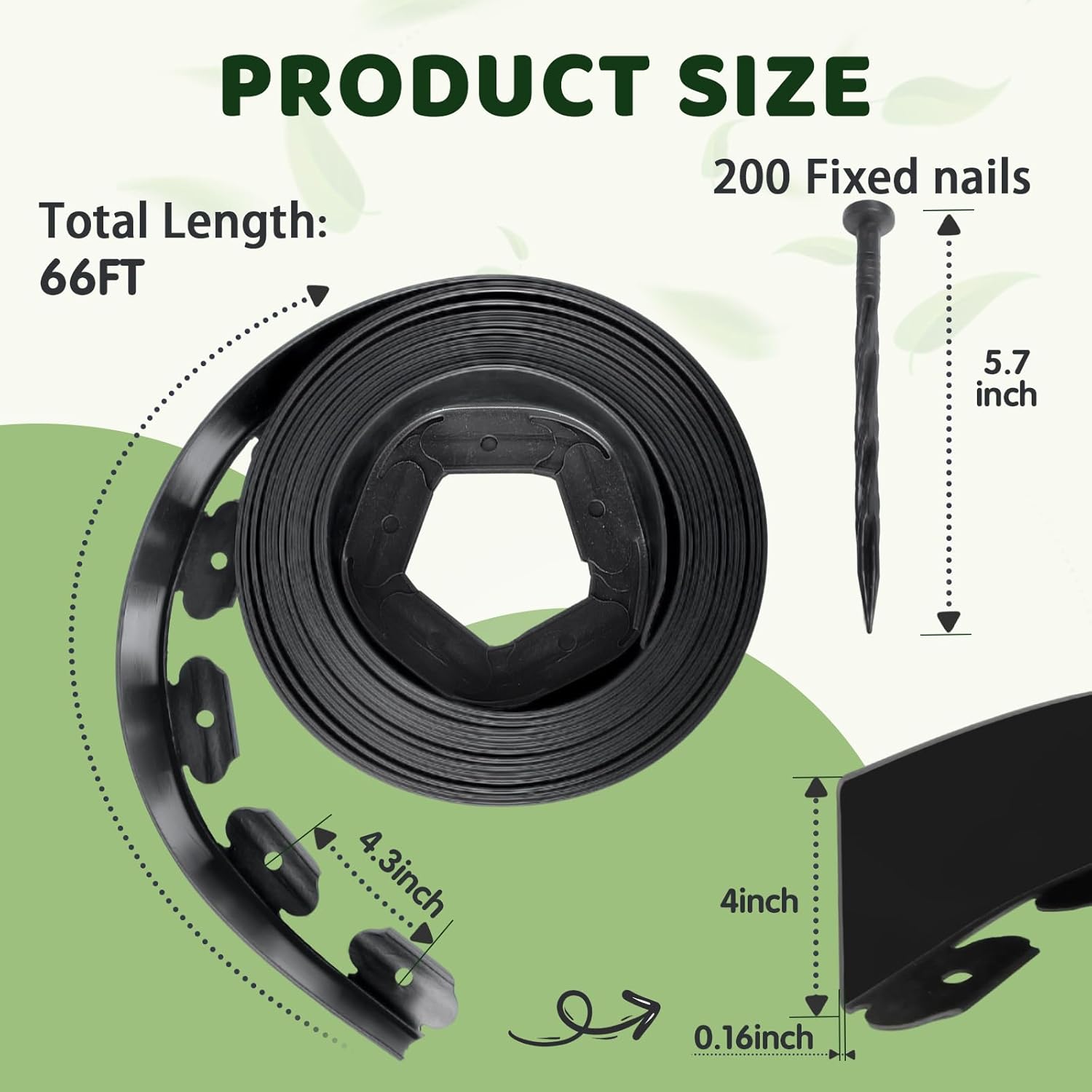 Landscape Edging - 4Inch x 66FT Garden Border with 200 PCS Spikes, Plastic Lawn Edging for Flower Bed, Pathway and Yard