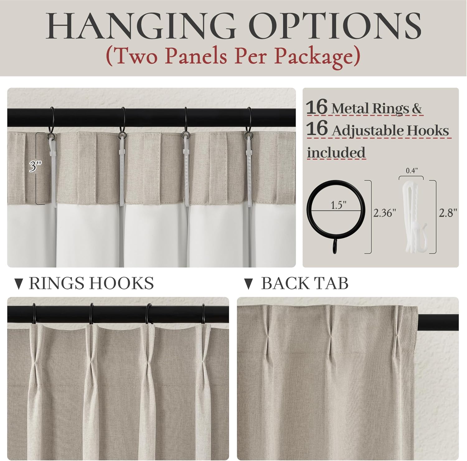 • Multiple Hanging Ways:3 hanging options to meet different home decor.1:Hanging with hooks on rings or track to easy slide (hooks,rings are included).2:Using back tab to hide the rod,easy to hang and hide the rod.3:Using clip rings(clip are not included)