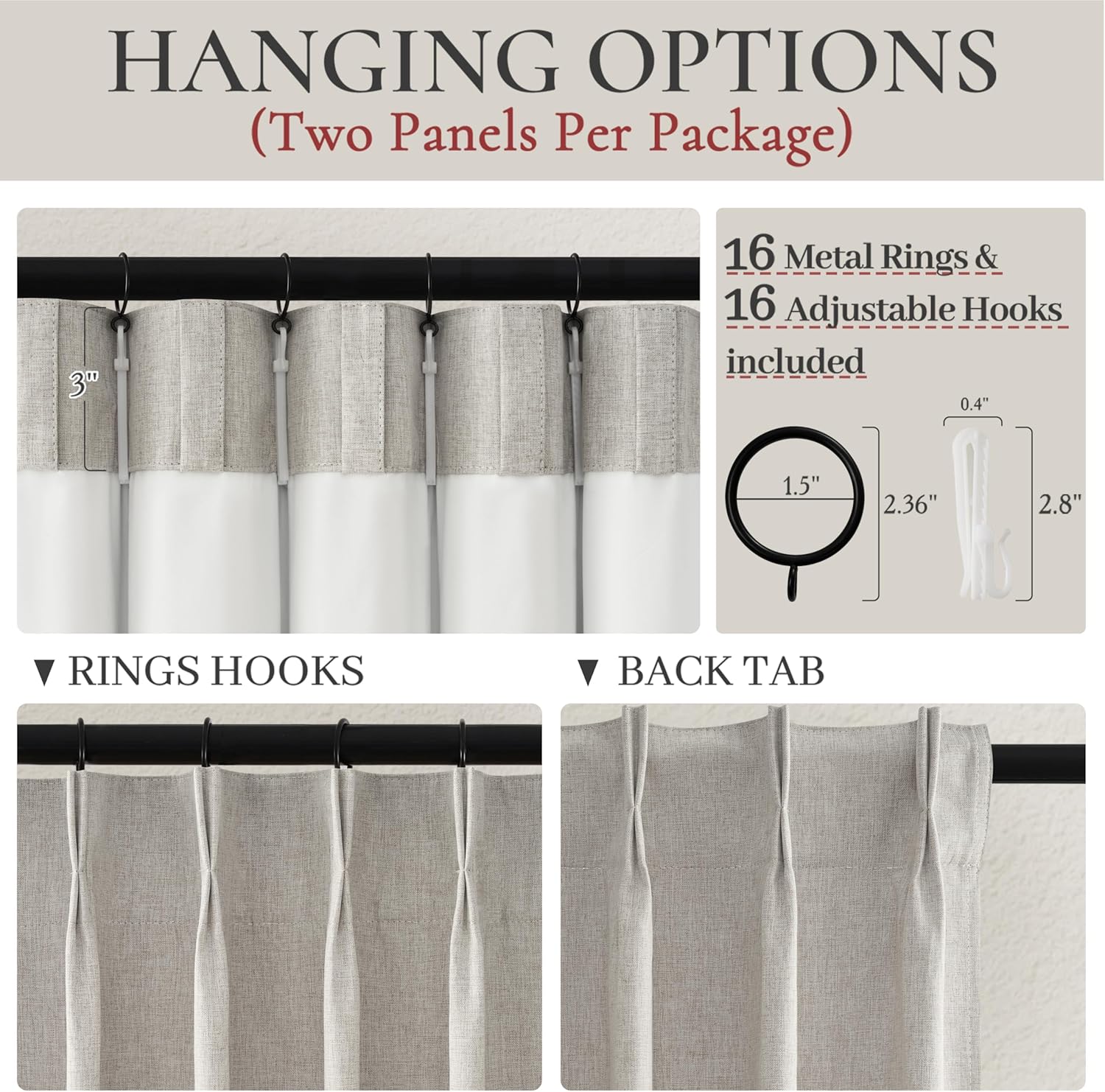 • Pinch Pleats Design:Each panel has 7 pleats.linen draperies are crafted from blended fabric(30%linen,70%polyester),drapes well and not easy-wrinkle.Suitable for various styles:modern,farmhouse,boho,neutral,bedroom,living room,nursery,sliding door,etc.