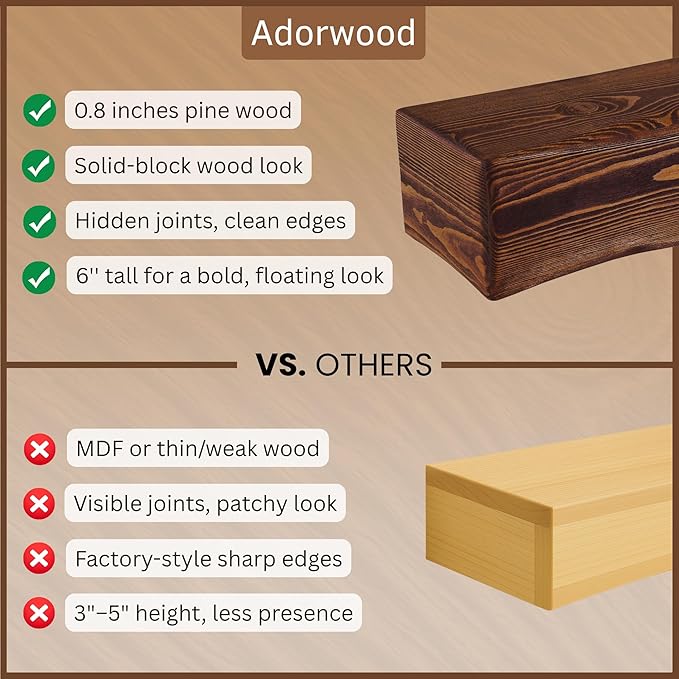 • GENUINE PINE WOOD TEXTURE: Each piece reveals natural knots, small cracks, and unique distressing, ensuring every mantel is one-of-a-kind. Due to the inherent characteristics of real wood, the grain and color may slightly differ from the samples shown.