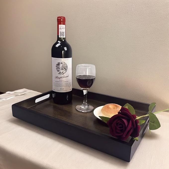 • Our rectangular wooden serving tray is made of natural and hard bamboo and wood, with a smooth surface and a mortise and tenon structure that is not easily broken or scattered. The appearance is simple, beautiful and generous. The unique black walnut color enhances its aesthetic appeal. But it's made of bamboo and wood.