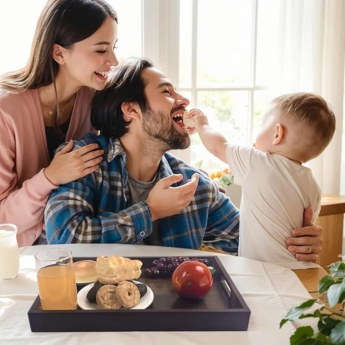 • Our bamboo tray is made of solid wood. Although it is made of bamboo, we give it black walnut color and texture to make it look different from other tray. It is very suitable for breakfast, lunch, dinner, bread, vegetables, bread, fruits, appetizers, desserts. It is also the best choice to serve food to friends at parties and bars. By using them, you will receive a lot of praise!