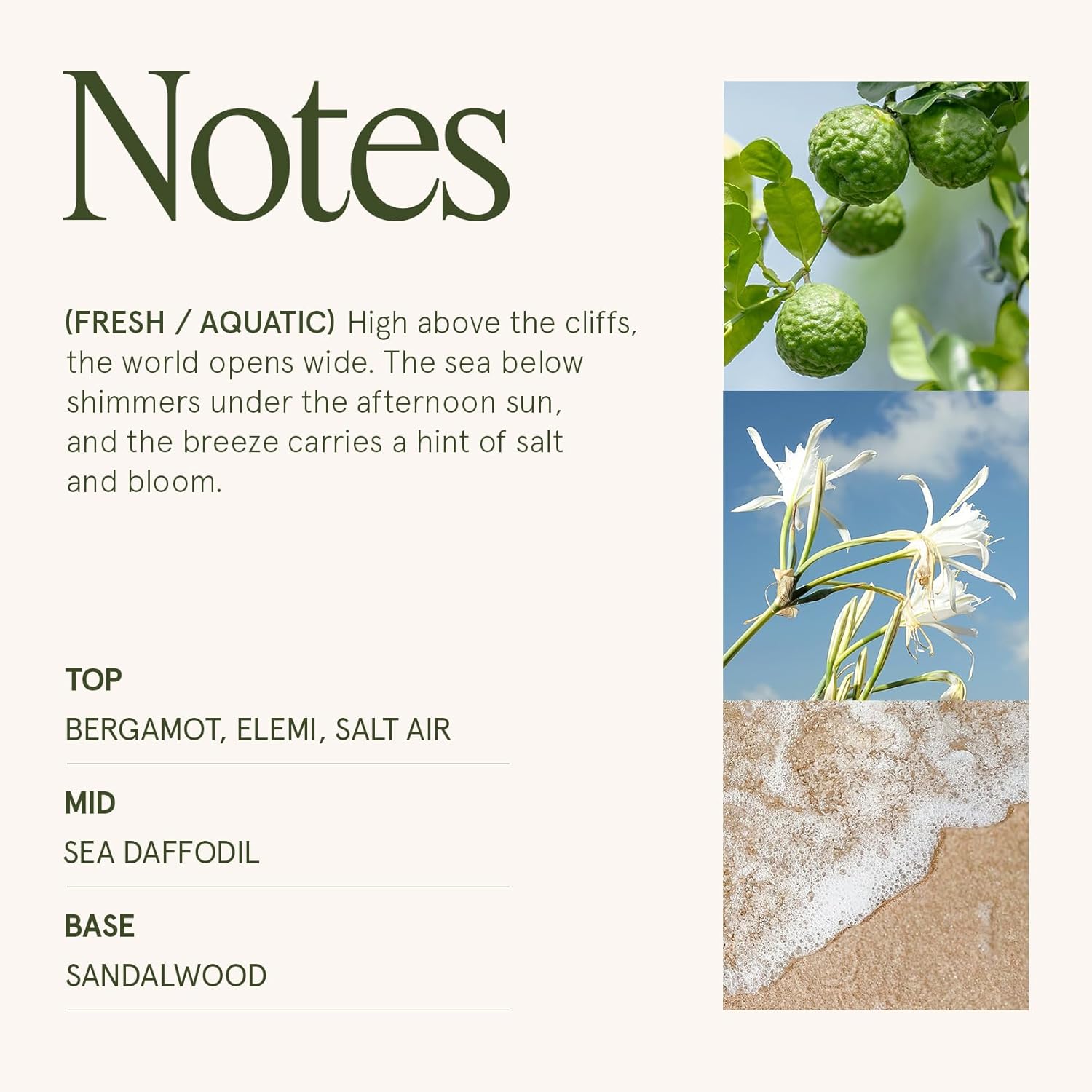 • SANTORINI SALT AIR: A refreshing fragrance that opens with bright mandarin, bergamot, elemi, and salt air, transitions into a floral heart of sea daffodil, muguet, and rose, and finishes with the warm, woody notes of cedarwood, tuberose, and sandalwood