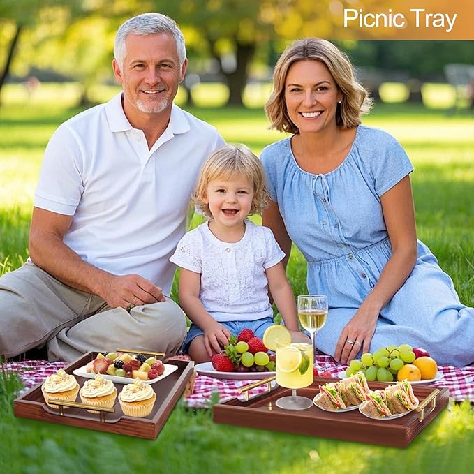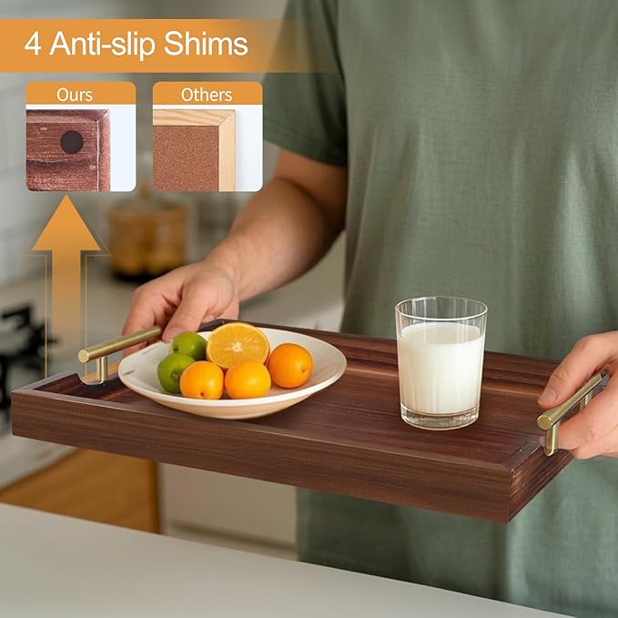 • [SELECT YOUR HANDLE COLOR] Why not cost one money to get double happiness? Try our deluxe large dark brown wooden tray for ottoman with 2 sets of handles. Now we offer two colors premium polished black and gold for replacement. Let's test your operational ability with the fantastic wood serving tray.