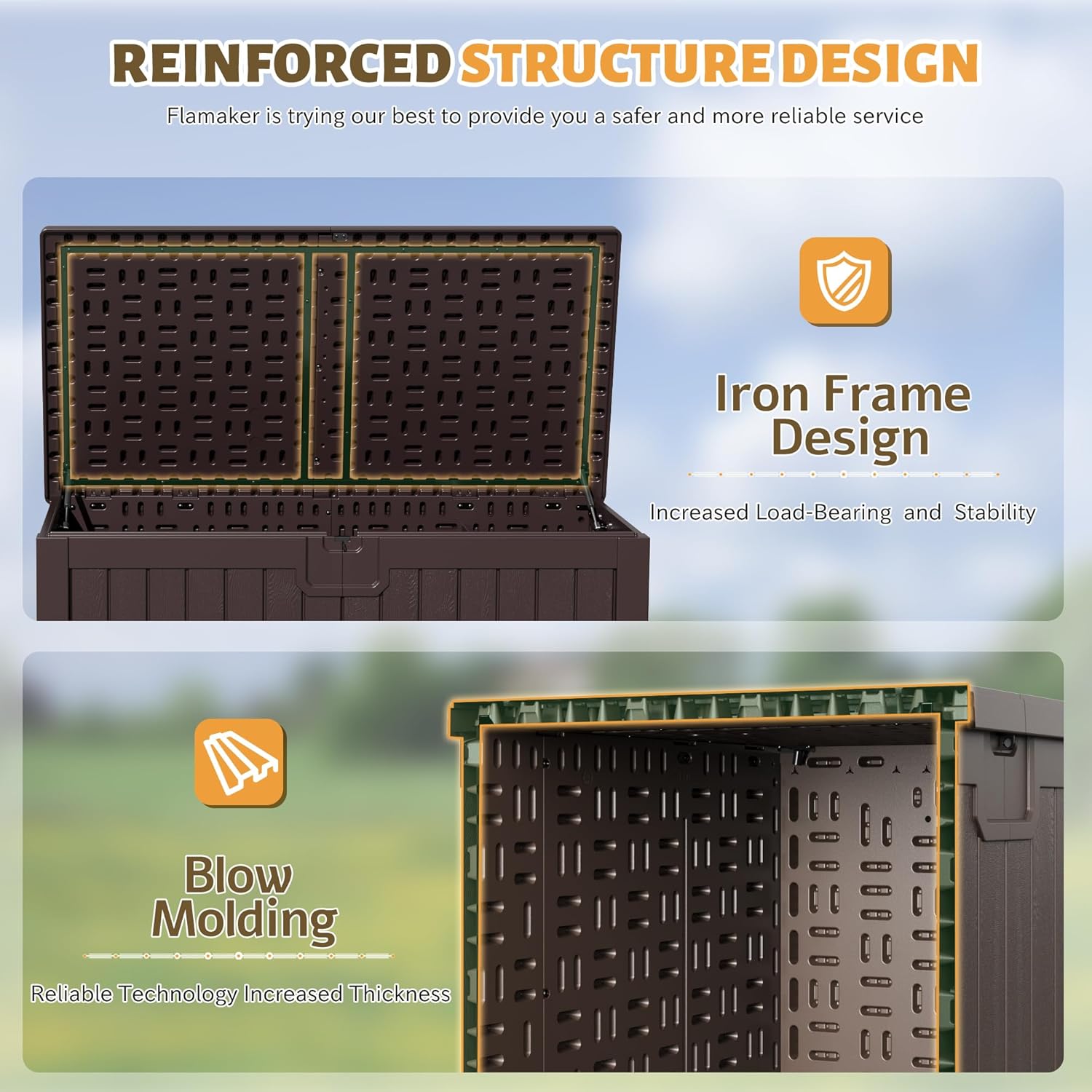 • [As a Seat] Flamaker’s large outdoor storage deck box, not only guarantees the storage capacity, but can be used as a seat, which can be used by up to 2 people
