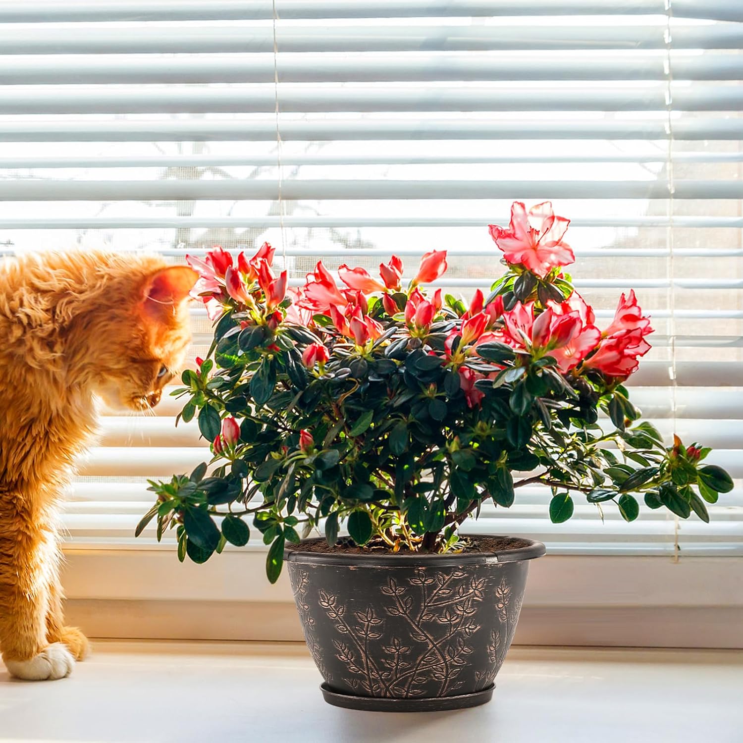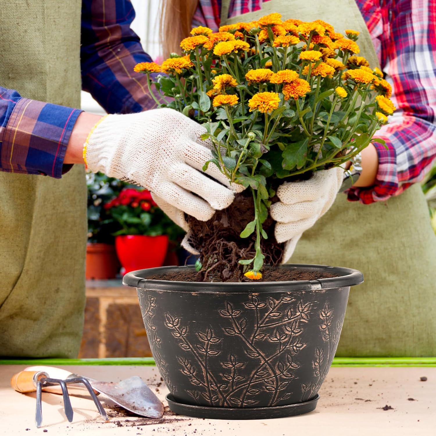 • 【Perfect Size & Retro Style】Top diameter: 12 inch, bottom diameter: 6.5 inch, height: 6.9 inch, capacity: 2 Gallon. 12 inch planters for indoor plant is perfect for planting medium to large sized plants.These flower pots outdoor is designed with climbing vines which is not just drawn on, they are “carved” into the surface. Plastic plant pots have a metal copper etching that is very attractive and add a retro feeling.