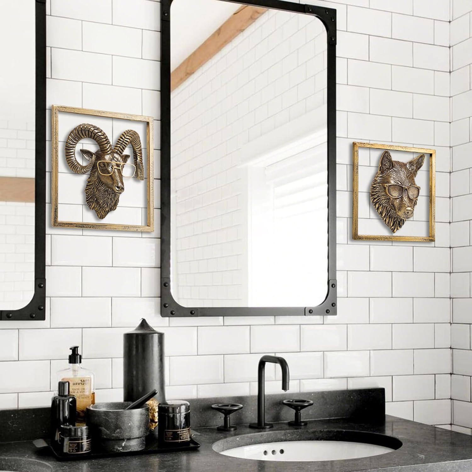 JJALIGHTS Animal Heads Wall Decor Resin Animals Sculptures Head Wall Hanging Decoration Imitation Copper vintage Wall Sculpture for Living Room Bedroom Office(Bighorn,Includes Metal Frame)