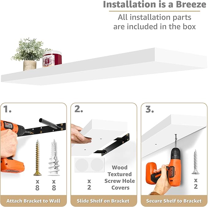 • Versatile & Functional Floating Wall Shelves: Floating shelves can also be used to hold beauty or hair products in the bathroom or bedroom. Place the wall shelves under a mirror in the entryway or exhibit family photos gallery style in a long hallway. Use as bathroom shelf, book shelf for wall, wall shelves for bedroom, above toilet shelf, kitchen shelves, shelves for room wall, floating shelves bathroom, living room wall shelf, display shelf and more