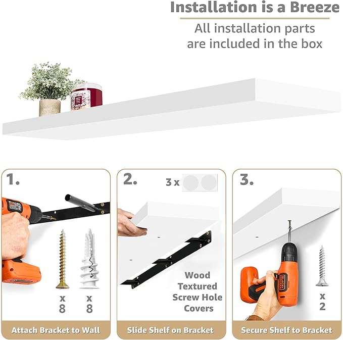 • Versatile & Functional Floating Wall Shelves: Floating shelves can also be used to hold beauty or hair products in the bathroom or bedroom. Place the wall shelves under a mirror in the entryway or exhibit family photos gallery style in a long hallway. Use as bathroom shelf, book shelf for wall, wall shelves for bedroom, above toilet shelf, kitchen shelves, shelves for room wall, floating shelves bathroom, living room wall shelf, display shelf and more