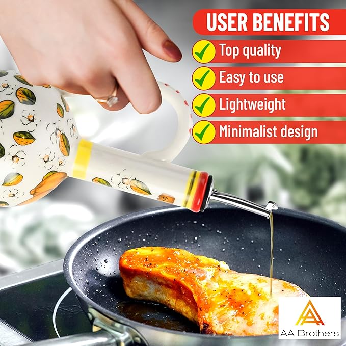 • Crafted With Ceramic: Each stoneware olive oil dispenser is made using durable and smooth ceramic that’s handcrafted and hand painted into a cruet bottle to keep your olive oil protected from UV rays, fresh, and ready to use while helping keep dust and bugs out