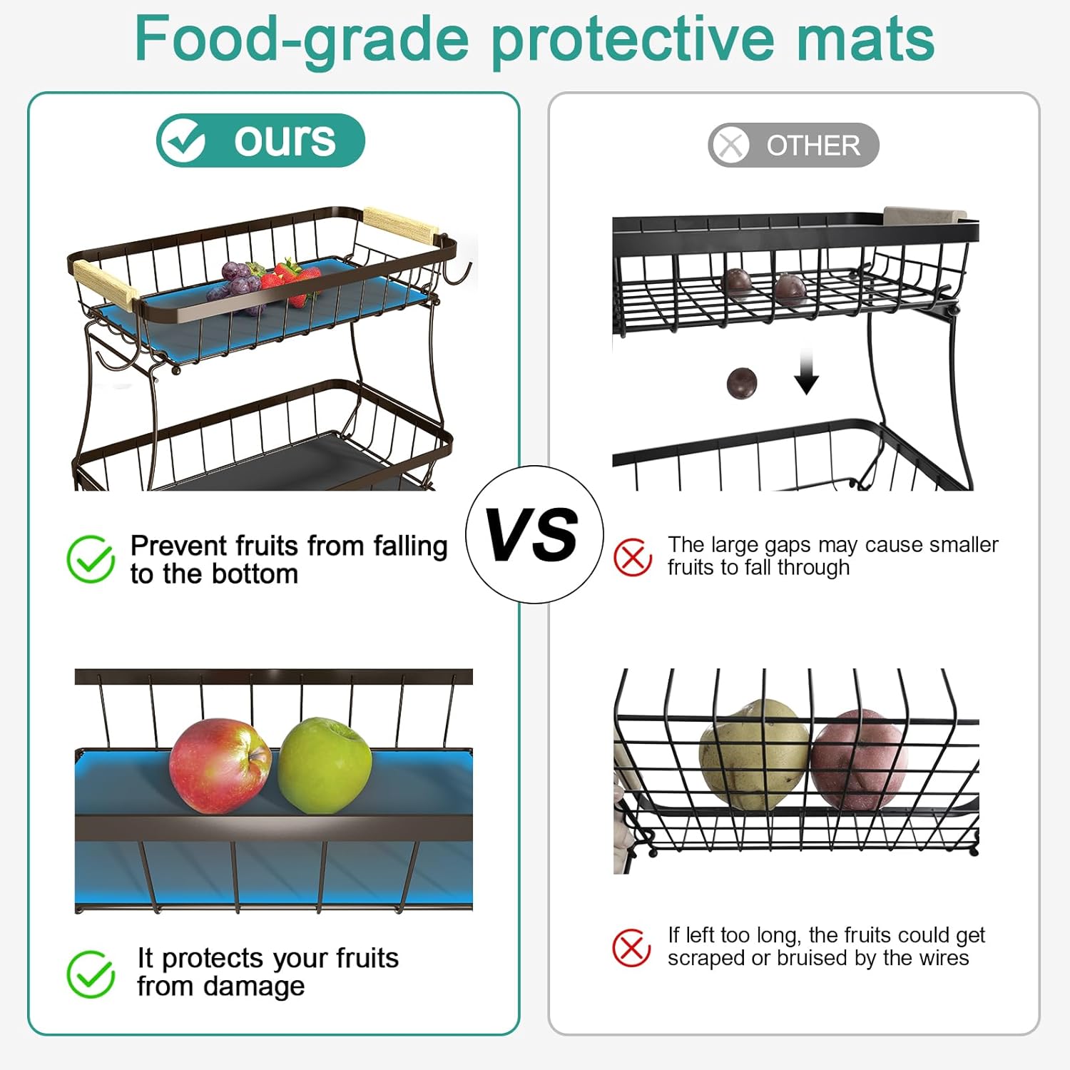 • Bonus mats prevent fruit from falling and protect against metal pressure marks.
