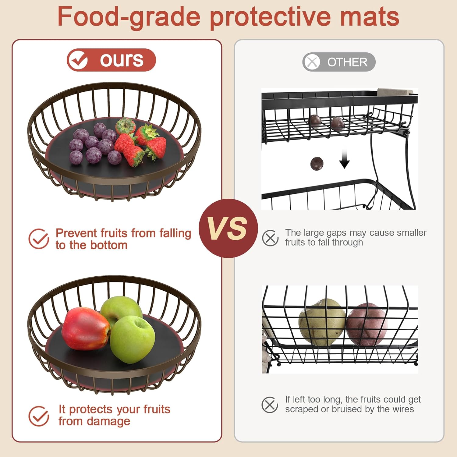 • Protects Fruit: Features a food-grade protective liner to prevent small fruits from falling and avoid pressure marks. Perfect fruit holder.