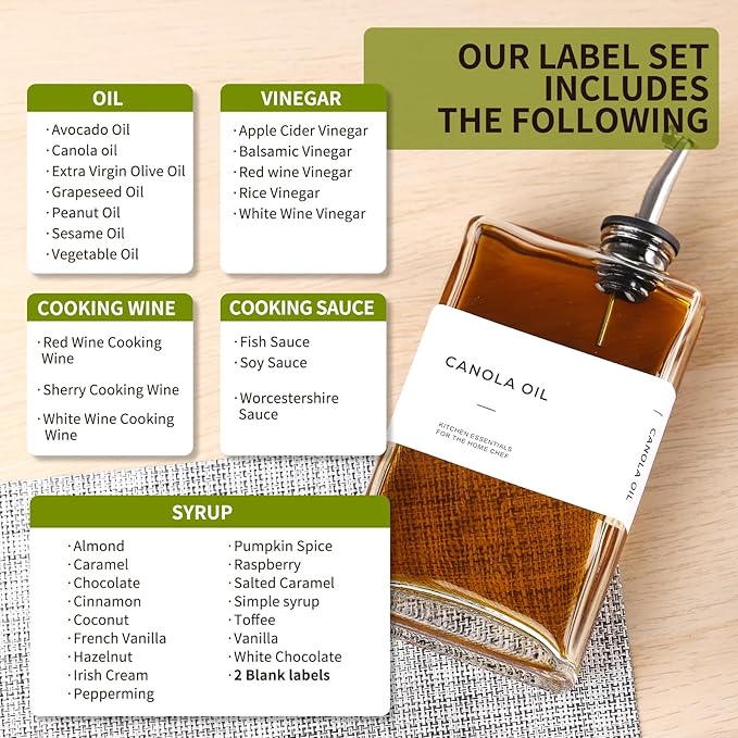• 【Modern Kitchen Essential】 Minimalism Inspired Cooking Oil Dispenser for Kitchen. This Set Includes Three High-quality 12 Oz (350 Ml) Glass kitchen Oil Dispensers, three spouts, a funnel, a make-pen and a 32 Label Set.