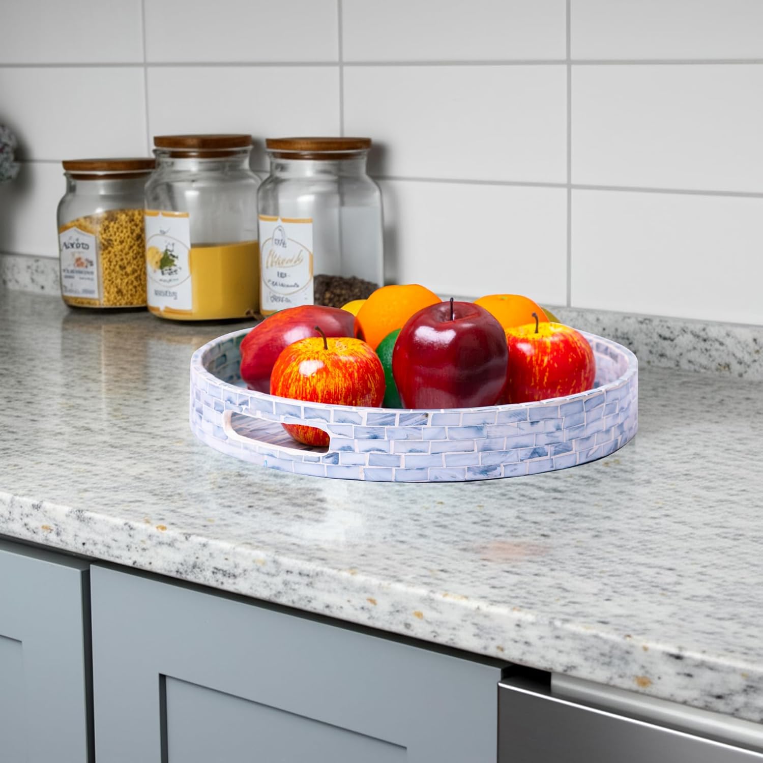 CLAYNIX Serving Tray 12.5 Inch, Wooden Lacquer Tray with Mother of Pearl Inlay, Elegant Tea & Breakfast Tray with Handles (Round)