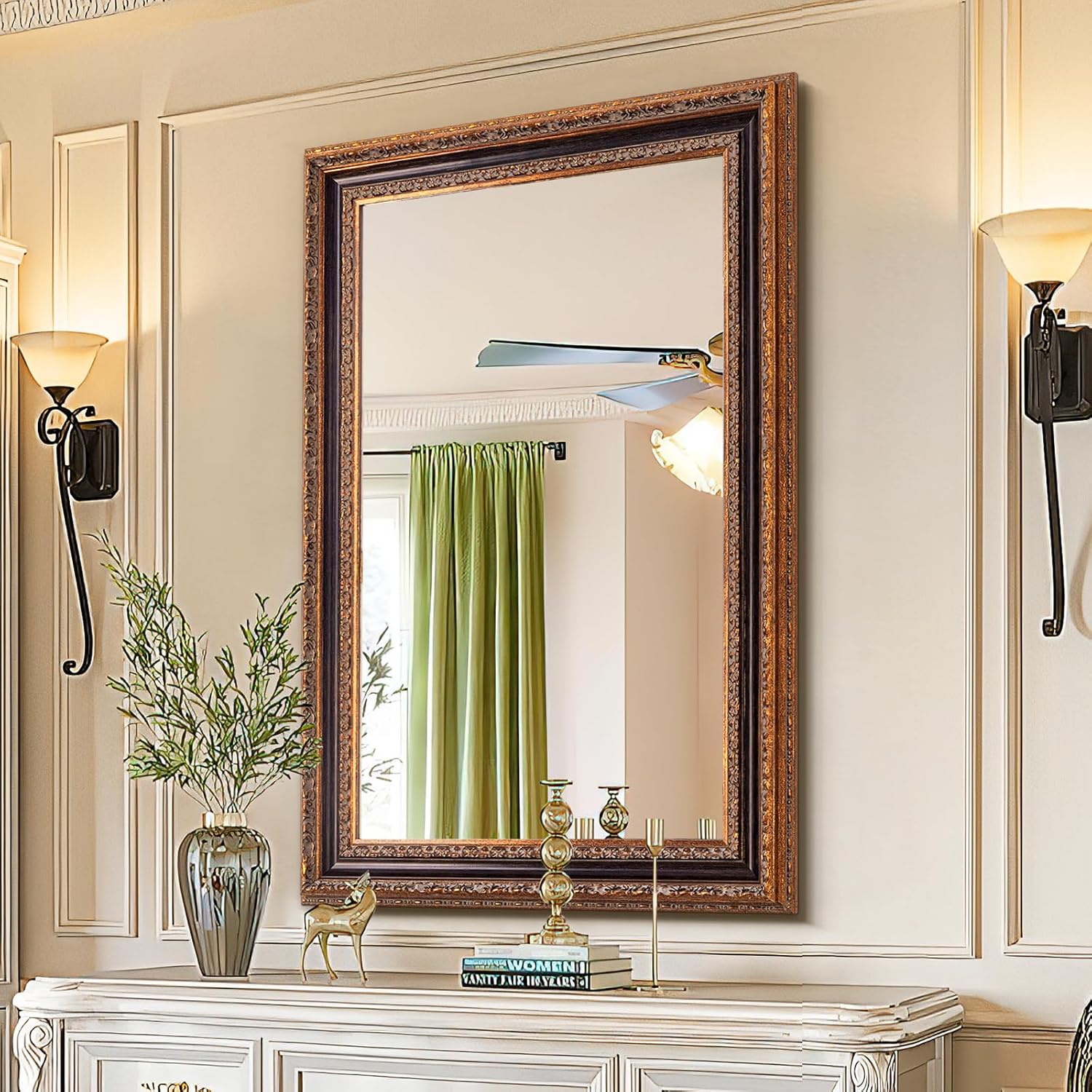 Antique Bronze Mirror 36.5" X 25", Bathroom Wall Mirror with Ornate Carvings Solid Wood Frame, Handmade Aging, for Vintage Living Room, Hallway and Bedroom