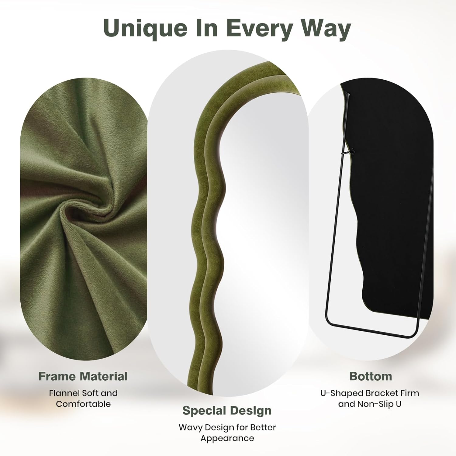 • Green Flannel Irregular Wavy Frame Floor Mirror: The full length standing mirror features a modern style that can complement any type of room decor, adding a touch of elegance to your room. It will be a great wall decor art piece for your home. This full body mirror with sleek looking is also great for selfies or pictures in general