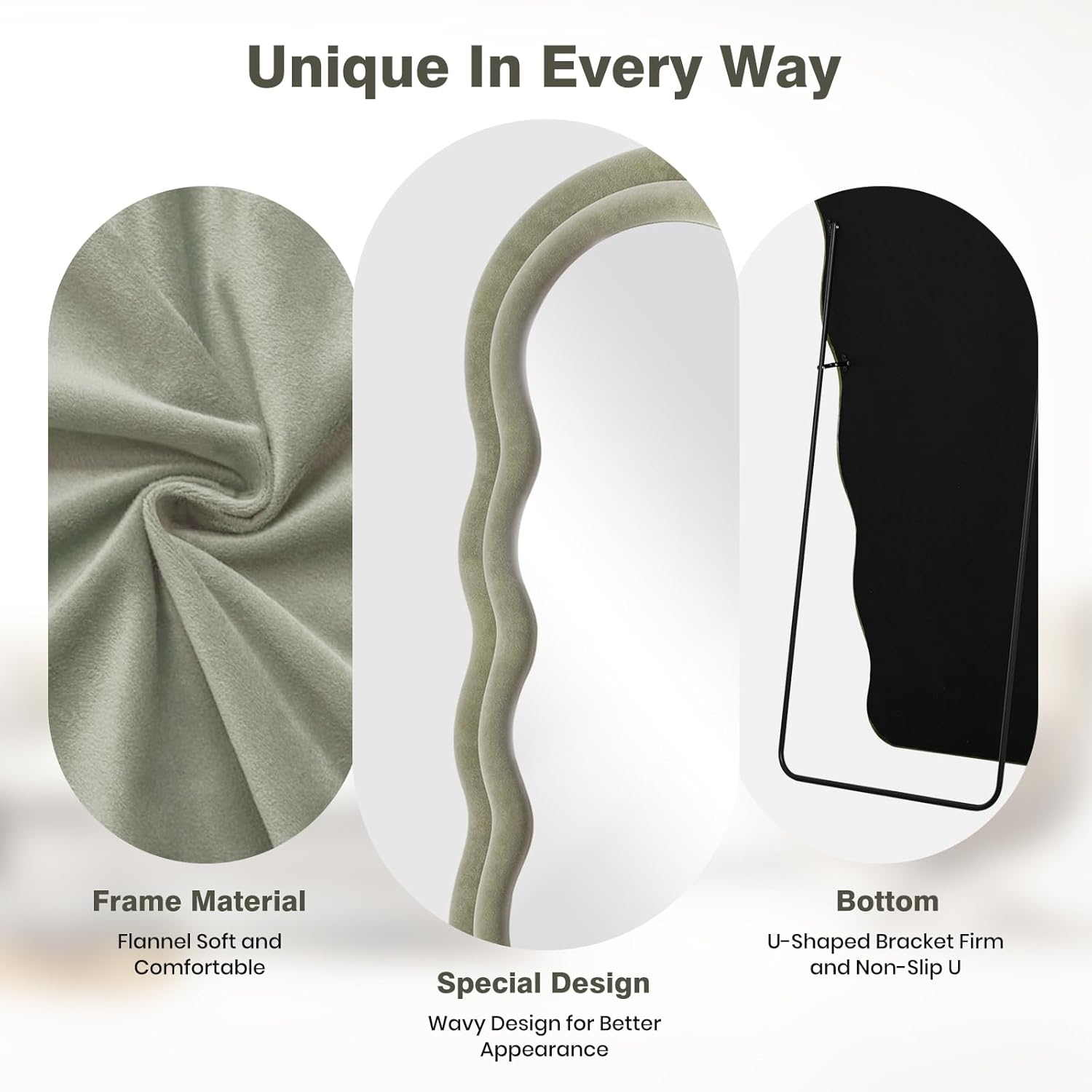 Full Length Mirror 63"x24" Arched Wavy Full Body Wall Mounted Floor Mirror with Stand Sage Flannel Frame Leaning Hanging Wall Mirror for Bedroom Entrance Hallway