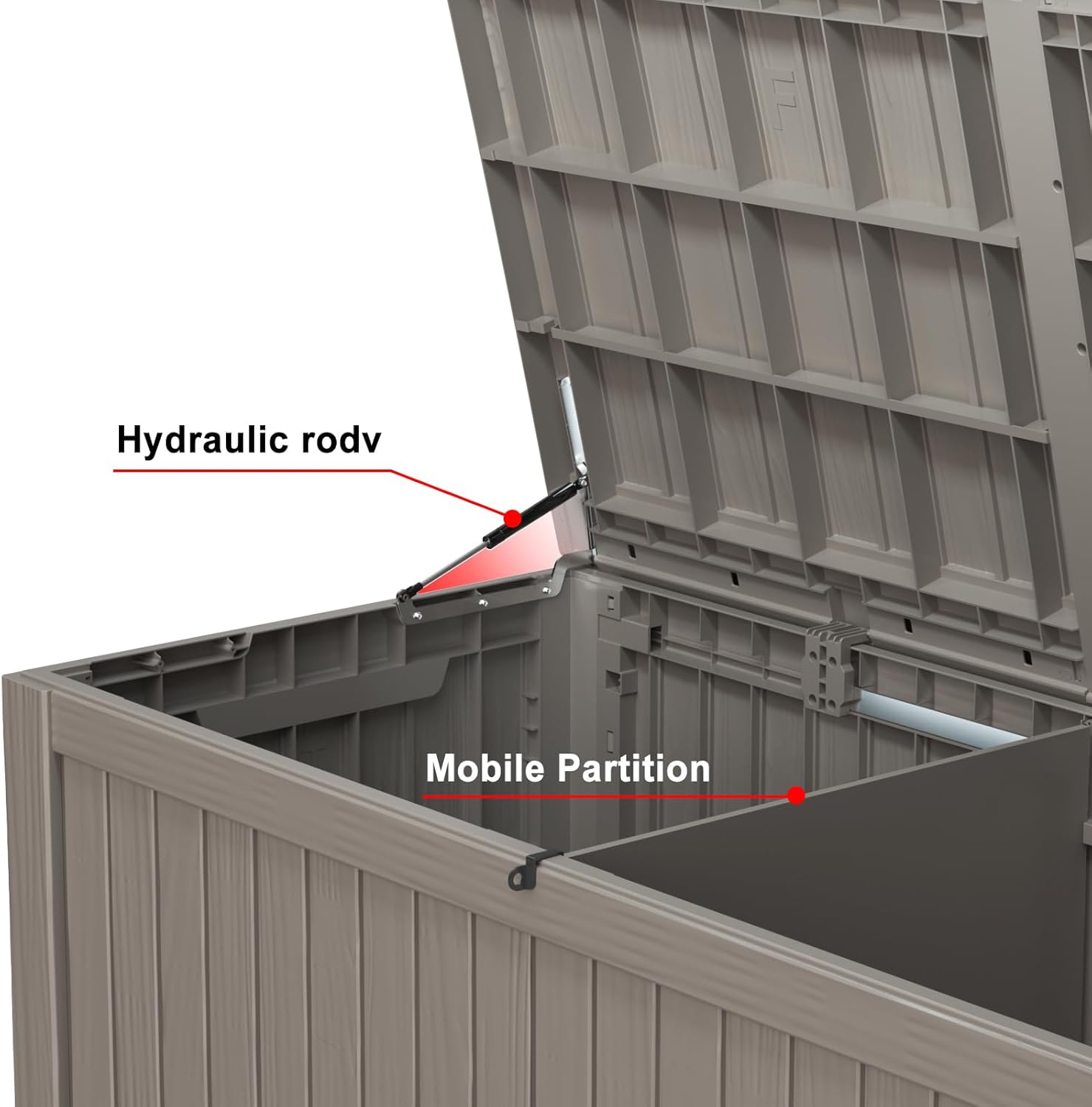 • Hydraulic Support for Easy Lid Opening:Equipped with hydraulic support, this deck box lid opens smoothly and stays open, providing easy access to your stored items. No need to struggle with heavy lids anymore.