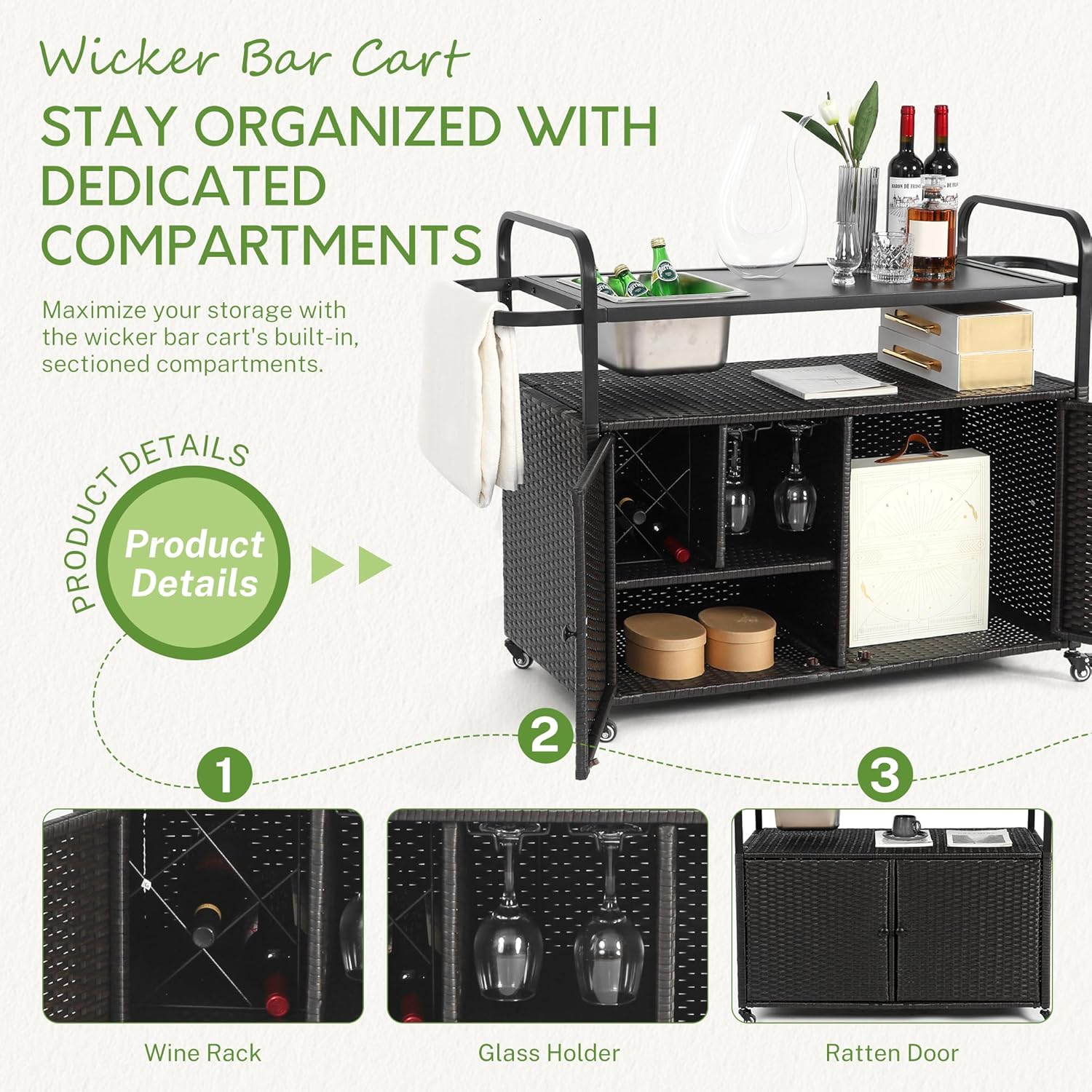 • ORGANIZED STORAGE: Stay organized with the wicker bar cart's dedicated compartments. The cart includes a wine rack and a glass holder, making it easy to store and access your bottles and drinkware. The smart design allows for quick setup and easy access